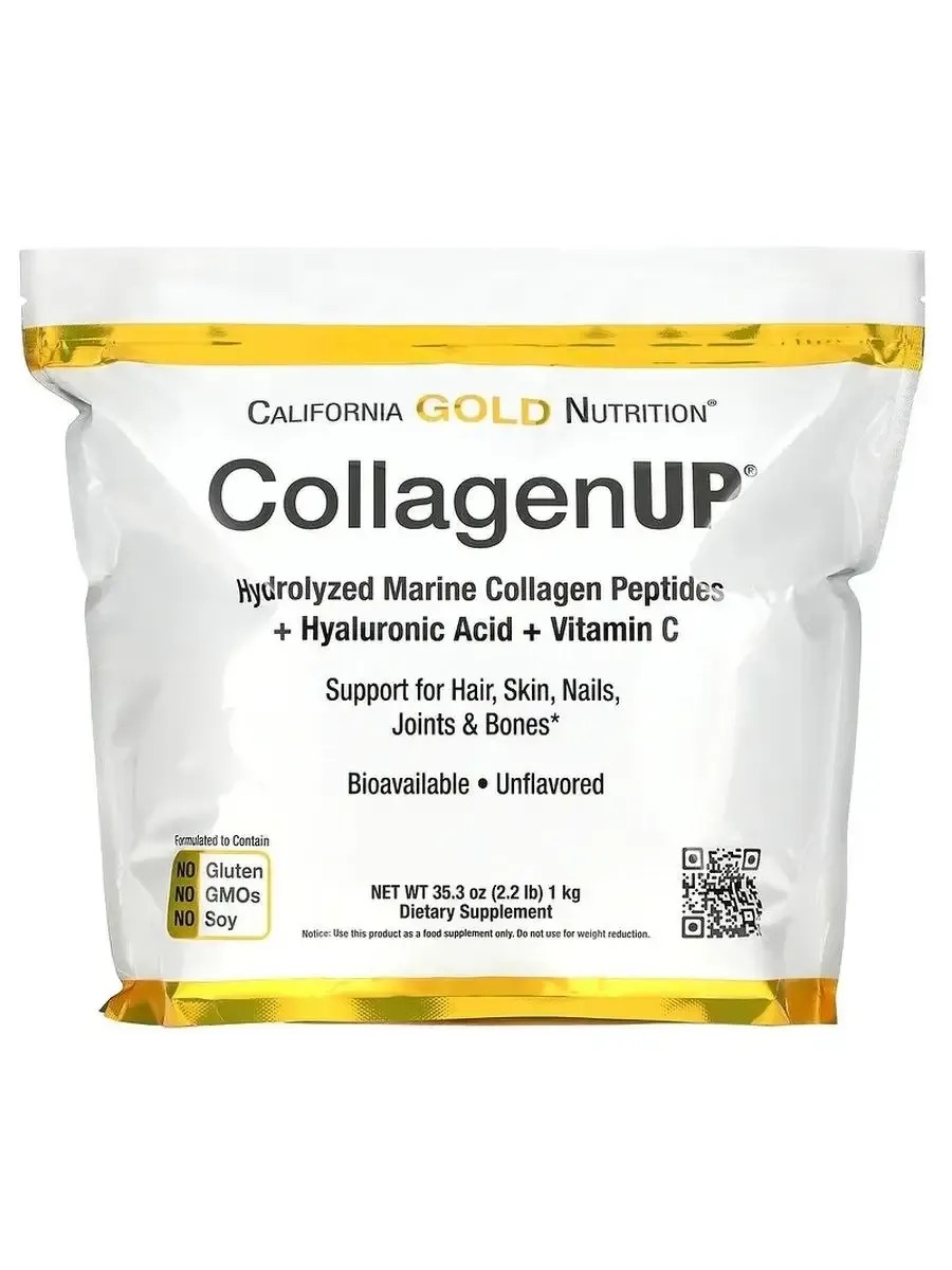 CollagenUP от California Gold Nutrition содержит пептиды морского коллагена (не бычьего происхождения), а также гиалуроновую кислоту и витамин C. Прошедший специальную обработку рыбий коллаген подвергается ферментативному гидролизу (расщеплению) до пептидов аминокислот с низким молекулярным весом, чтобы обеспечить оптимальную усвояемость и биодоступность.