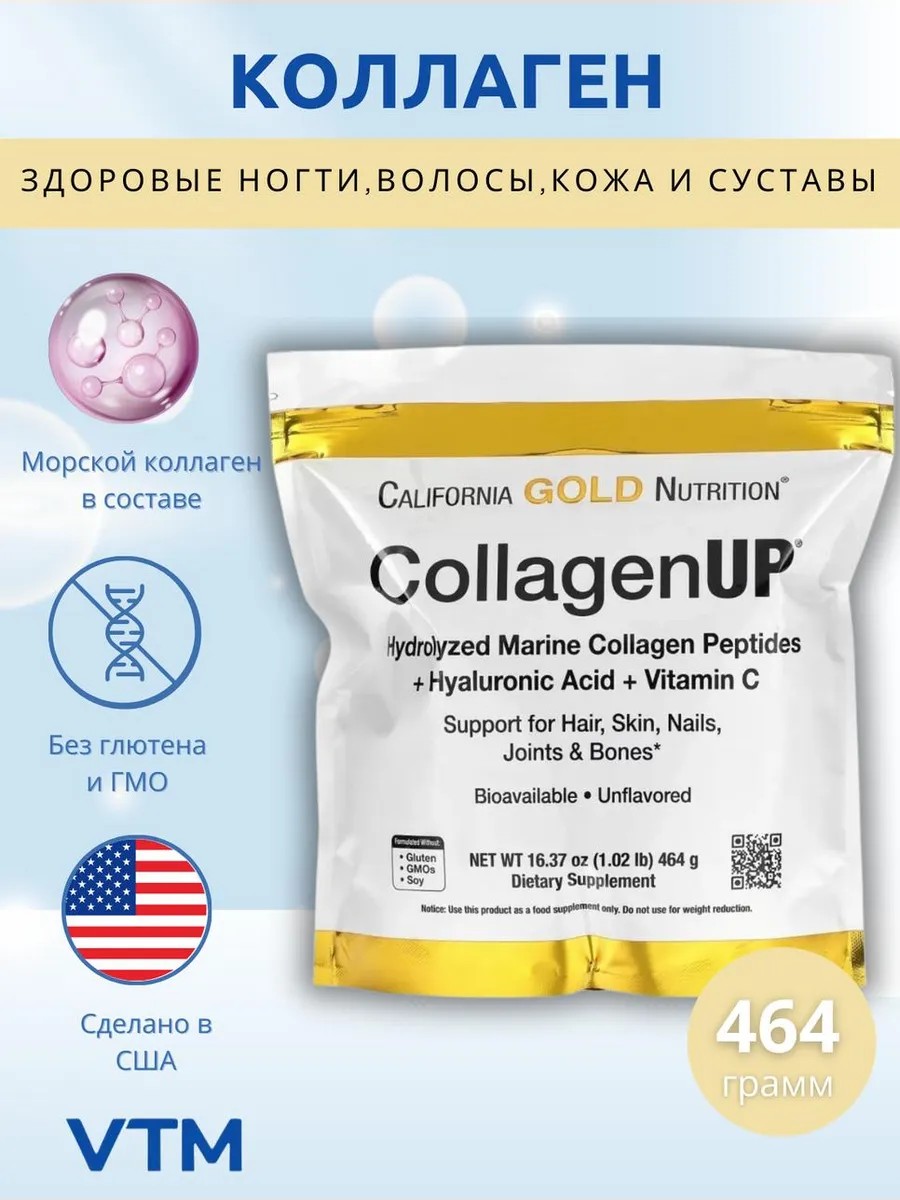 California Gold Nutrition CollagenUp, содержит пептиды морского коллагена без добавления бычьего коллагена, а также гиалуроновую кислоту и витамин C неживотного происхождения.