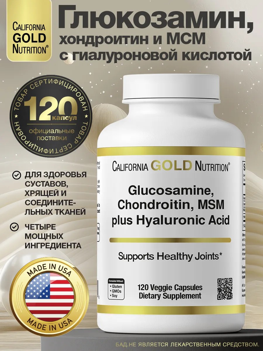 California Gold NutritionГлюкозамин, хондроитин, МСМ, плюс гиалуроновая кислота Содержит вегетарианский глюкозамин GreenGrown и метилсульфонилметан OptiMSM Поддерживает Здоровые Суставы Хондроитин из бычьего хряща и гиалуроновая кислота из неживотного источника Не содержит глютена, ГМО или сои. Произведено на предприятии, прошедшем аудит третьей стороной и зарегистрированном (сертифицированном) в соответствии со стандартом cGMP 100% Золотая Гарантия Содержит ингредиенты, полученные из мяса крупного рогатого скота Ежедневная нагрузка на суставы может привести к ухудшению их состояния и вызвать дискомфорт. California Gold Nutrition Глюкозамин, хондроитин, метилсульфонилметан, плюс гиалуроновая кислота содержат мощные соединения, которые помогают поддерживать здоровье суставов. Наша Мощная Добавка к Глюкозамину Эта добавка содержит четыре мощных ингредиента, которые поддерживают здоровье суставов. Каждый ингредиент был специально подобран для поддержания здоровья суставов, в том числе хрящей и соединительных тканей. Наша формула включает в себя следующее: Глюкозамин ценится как ключевой ингредиент в составах для ухода за суставами. Наша добавка содержит GreenGrown — глюкозамин из 100% растительного сырья, который соответствует спецификациям USP и защищен патентами США и ЕС. На современном огромном рынке средств для ухода за суставами GreenGrown является ведущим глюкозамином из растительного сырья. Хондроитинсульфат — это гликозаминогликан (ГАГ), который естественным образом присутствует во многих тканях организма и является особенно важным компонентом суставного хряща и синовиальной ткани. Хондроитин способствует удержанию воды в суставе, придавая ему эластичность и действуя как смазка и амортизатор.Таким образом, это питательное вещество помогает поддерживать здоровье и гибкость суставной ткани и способствует нормальной подвижности и комфорту суставов. МСМ (метилсульфонилметан), также известный как диметилсульфон (DMSO2) и метилсульфон, представляет собой органическое серосодержащее соединение, необходимое для оптимального здоровья. Без достаточного количества серы МСМ ваш организм не сможет поддерживать необходимый уровень гомеостаза. Наша добавка содержит OptiMSM, который зарекомендовал себя как самый чистый, безопасный и стабильный МСМ в мире. Гиалуроновая кислотаприсутствует в каждой ткани организма, но наибольшая её концентрация наблюдается в соединительных тканях, таких как кожа и хрящи. Гиалуроновая кислота является важным компонентом синовиальной жидкости, где она служит смазкой и играет роль в сопротивлении силам сжатия. Размер порции: 2 капсулы Количество порций в упаковке: 60 Количество на порцию: Глюкозамин HCl 750 мг Сульфат хондроитина 600 мг МСМ (метилсульфонилметан) 500 мг Гиалуроновая кислота (Гиалуронат натрия) 50 мг Другие Ингредиенты Модифицированная целлюлоза (растительная капсула Hypromellose) и стеарат магния. Рекомендуемое использование Принимайте по 2 вегетарианские капсулы в день, во время еды или без нее. Лучше всего принимать по назначению квалифицированного медицинского работника. Предупреждения Хранить в недоступном для детей месте. Проконсультируйтесь с лицензированным врачом, фармацевтом, натуропатом или другим квалифицированным медицинским работником, прежде чем принимать пищевые добавки.