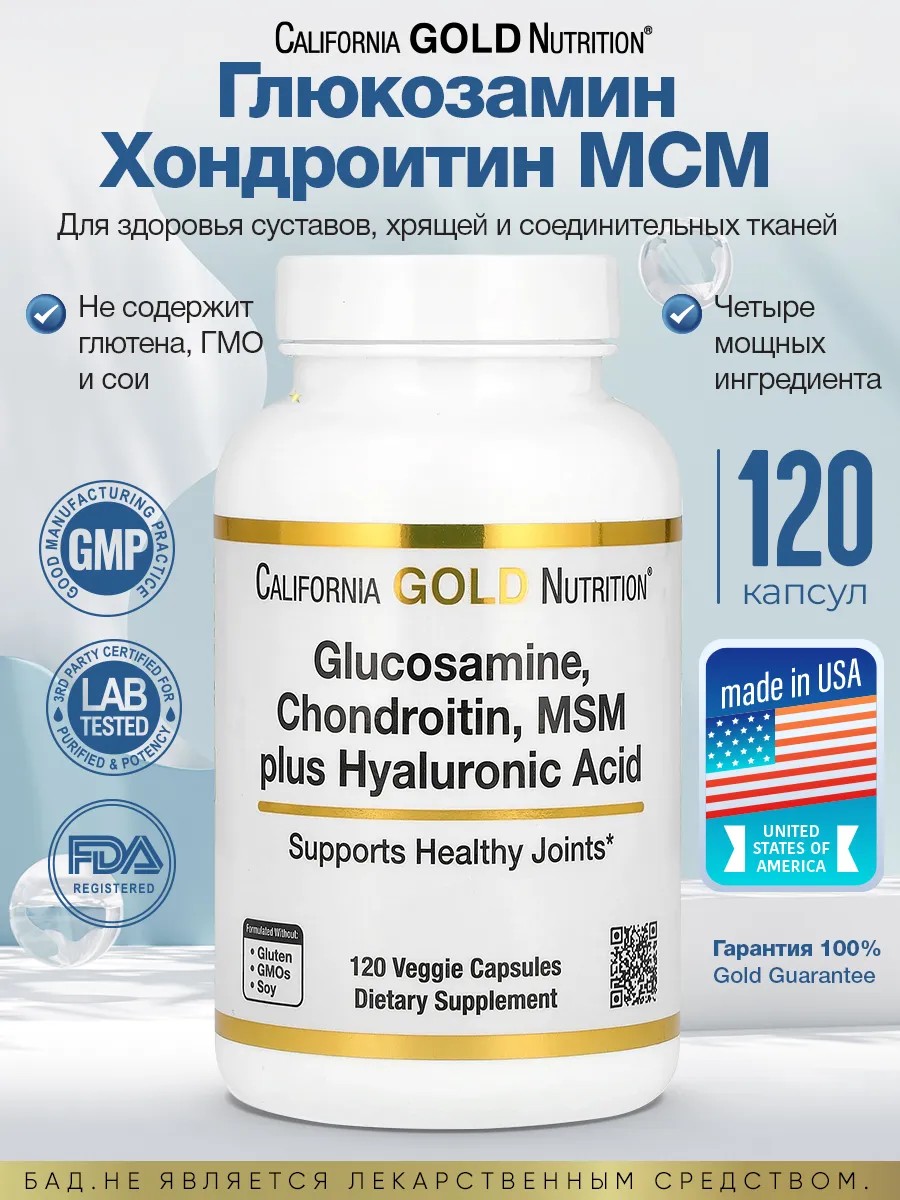 California Gold NutritionГлюкозамин, хондроитин, МСМ, плюс гиалуроновая кислота Содержит вегетарианский глюкозамин GreenGrown и метилсульфонилметан OptiMSM Поддерживает Здоровые Суставы Хондроитин из бычьего хряща и гиалуроновая кислота из неживотного источника Не содержит глютена, ГМО или сои. Произведено на предприятии, прошедшем аудит третьей стороной и зарегистрированном (сертифицированном) в соответствии со стандартом cGMP 100% Золотая Гарантия Содержит ингредиенты, полученные из мяса крупного рогатого скота Ежедневная нагрузка на суставы может привести к ухудшению их состояния и вызвать дискомфорт. California Gold Nutrition Глюкозамин, хондроитин, метилсульфонилметан, плюс гиалуроновая кислота содержат мощные соединения, которые помогают поддерживать здоровье суставов. Наша Мощная Добавка к Глюкозамину Эта добавка содержит четыре мощных ингредиента, которые поддерживают здоровье суставов. Каждый ингредиент был специально подобран для поддержания здоровья суставов, в том числе хрящей и соединительных тканей. Наша формула включает в себя следующее: Глюкозамин ценится как ключевой ингредиент в составах для ухода за суставами. Наша добавка содержит GreenGrown — глюкозамин из 100% растительного сырья, который соответствует спецификациям USP и защищен патентами США и ЕС. На современном огромном рынке средств для ухода за суставами GreenGrown является ведущим глюкозамином из растительного сырья. Хондроитинсульфат — это гликозаминогликан (ГАГ), который естественным образом присутствует во многих тканях организма и является особенно важным компонентом суставного хряща и синовиальной ткани. Хондроитин способствует удержанию воды в суставе, придавая ему эластичность и действуя как смазка и амортизатор.Таким образом, это питательное вещество помогает поддерживать здоровье и гибкость суставной ткани и способствует нормальной подвижности и комфорту суставов. МСМ (метилсульфонилметан), также известный как диметилсульфон (DMSO2) и метилсульфон, представляет собой органическое серосодержащее соединение, необходимое для оптимального здоровья. Без достаточного количества серы МСМ ваш организм не сможет поддерживать необходимый уровень гомеостаза. Наша добавка содержит OptiMSM, который зарекомендовал себя как самый чистый, безопасный и стабильный МСМ в мире. Гиалуроновая кислотаприсутствует в каждой ткани организма, но наибольшая её концентрация наблюдается в соединительных тканях, таких как кожа и хрящи. Гиалуроновая кислота является важным компонентом синовиальной жидкости, где она служит смазкой и играет роль в сопротивлении силам сжатия. Размер порции: 2 капсулы Количество порций в упаковке: 60 Количество на порцию: Глюкозамин HCl 750 мг Сульфат хондроитина 600 мг МСМ (метилсульфонилметан) 500 мг Гиалуроновая кислота (Гиалуронат натрия) 50 мг Другие Ингредиенты Модифицированная целлюлоза (растительная капсула Hypromellose) и стеарат магния. Рекомендуемое использование Принимайте по 2 вегетарианские капсулы в день, во время еды или без нее. Лучше всего принимать по назначению квалифицированного медицинского работника. Предупреждения Хранить в недоступном для детей месте. Проконсультируйтесь с лицензированным врачом, фармацевтом, натуропатом или другим квалифицированным медицинским работником, прежде чем принимать пищевые добавки.