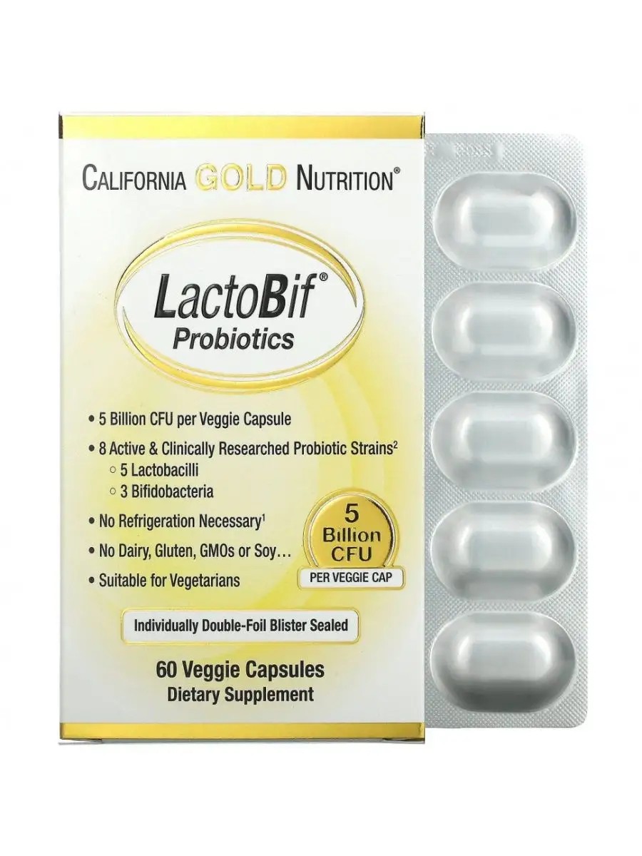 Пробиотик Lactobif California Gold Nutrition содержит 8 активных и клинически изученных штаммов пробиотиков (5 видов лактобактерий и 3 вида бифидобактерий). Исследования подтверждают, что пробиотические штаммы в составе пробиотика Lactobif чрезвычайно устойчивы к низким уровням pH и воздействию факторов желудочно-кишечного тракта (например, кислоты, желчи, пепсина, панкреатина), а также закрепляются на клеточных линиях кишечника.Оптимальная защита от воздействия кислорода, влаги и света.Приготовление домашних ферментированных продуктов (йогурта, кефира, кваса и т. п.) — это искусство, для которого необходимы закваски с особыми пробиотическими культурами. Пробиотик LactoBif не предназначен для использования в качестве закваски, но капсулы с пробиотиком LactoBif можно открывать и добавлять их содержимое в молочные коктейли, смузи и т. п.Принимать по 1 капсуле в день независимо от приема пищи. Рекомендуется принимать в соответствии с назначением квалифицированного медицинского работника.