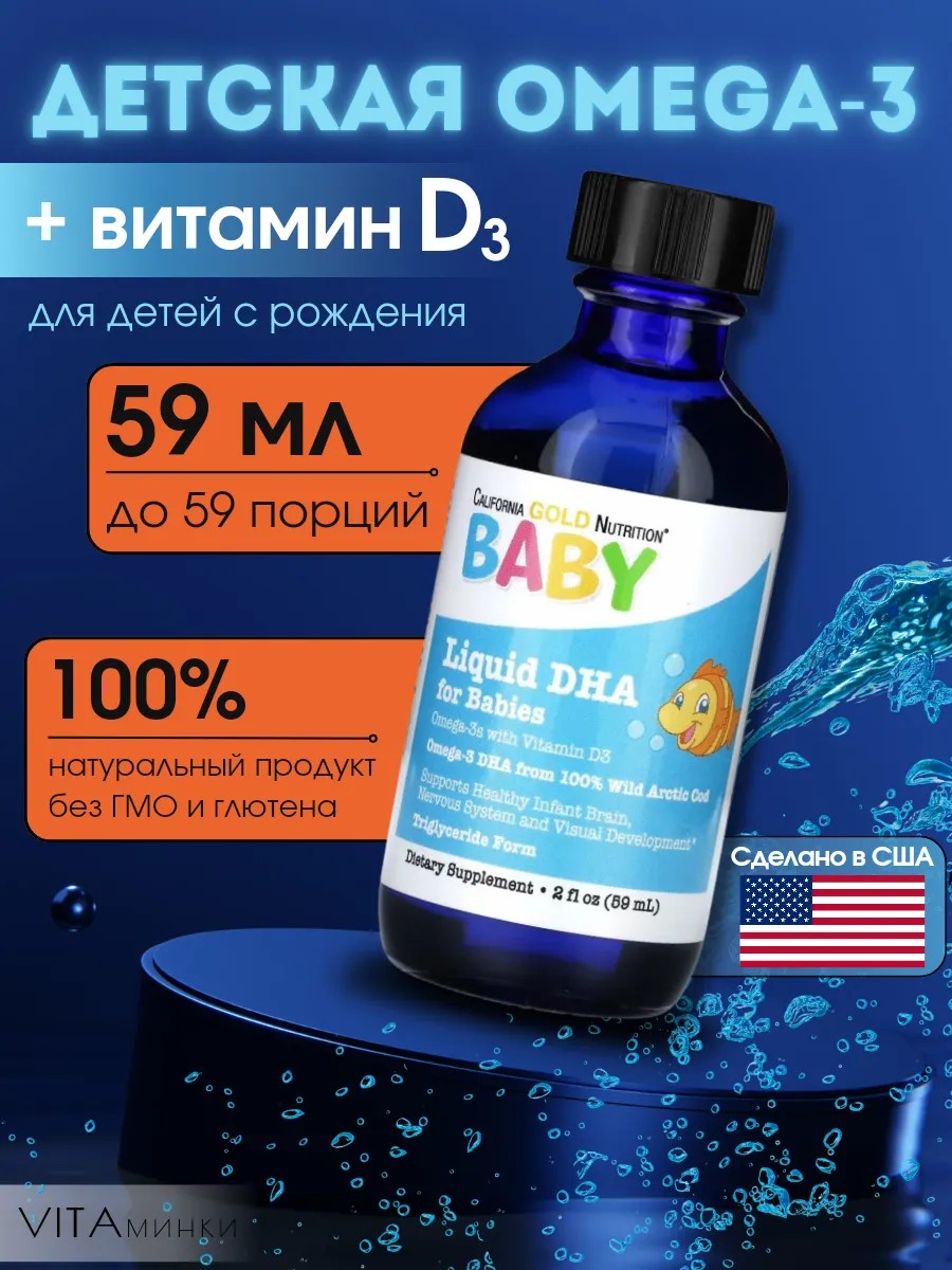 Oмега - 3 для детей капли от California Gold Nutrition содержит незаменимые жирные кислоты омега-3 и витамин д 3, которые способствуют здоровому росту и развитию мозга ребенка. Baby DHA Omega 1050, Vitamin D3 - это жирная кислота, которая является важным строительным материалом для развития мозга, нервной системы и зрения ребенка. Состоит из норвежской трески, выловленной в природной среде. Рыбий жир жидкий для детей от Калифорния Голд Нутришн с витамином Д3 капли, полученный исключительно из жира печени дикой норвежской трески в самой предпочтительной форме — в виде триглицеридов. Без глютена и ГМО. Комплекс витаминов, имеющих в составе жирные кислоты играет важную роль в поддержании оптимального здоровья и хорошего самочувствия, а бады Омега 3 ЭПК и ДГК известны своей поддержкой многих функциональных систем организма. Прием мультивитаминов поможет получить необходимое количество для организма, даже если в рационе ребенка не хватает этих питательных веществ, а также для поддержания иммунитета Вашего малыша. Так же Омега 3 улучшает микроциркуляцию сетчатки глаза. Докозагексаеновая кислота Омега 3 является незаменимым структурным компонентом клеточных мембран сетчатки глаза. Рекомендации по применению: добавляйте в детское питание или другую еду, или применяйте в соответствии с указаниями педиатра. Храните флакон с оригинальной крышечкой в холодильнике