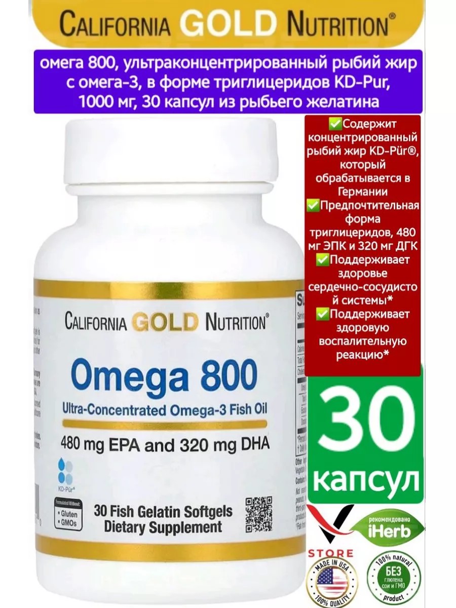California Gold Nutrition Omega 800, 30 Fish Gelatin Softgels California Gold Nutrition Omega 800, 30 Fish Gelatin Softgels is the ideal vitamin complex and supplement, formulated specifically to support the health and active lifestyle of adult men and women. Omega 3 is an essential nutrient that plays a vital role in brain function, cardiovascular health, and joint health. Omega 3 contains high concentrations of omega-3 fatty acids, including EPA (eicosapentaenoic acid) and DHA (docosahexaenoic acid), which are important and effective for maintaining cardiovascular health, improving memory and brain function, and strengthening ligaments and joints. This sports nutrition complex helps maintain normal cholesterol, enhances protection against free radicals, helps reduce the risk of cardiovascular disease, and has beneficial properties for weight loss and weight management. An important aspect of women's health, Omega-3 also has a beneficial effect on beauty and appearance. Regular consumption helps improve skin condition, promotes growth and prevents hair loss, nails, and teeth, making them healthier and more beautiful. This is especially important for women who want to maintain their youth and attractiveness. Omega-3 is a natural product derived from high-quality fish oil. The high concentration of omega-3 fatty acids makes it one of the most effective products for supporting heart, brain, and joint health. This premium vitamin and dietary supplement complex is specially designed for active people involved in sports or simply striving for a healthy lifestyle. Omega-3 is an essential nutrient that helps athletes increase their energy and endurance, improve recovery after workouts, and reduce the risk of ligament and joint damage. This effective sports nutrition is designed to give everyone the opportunity to enjoy all the benefits necessary for optimal body function. To summarize, Amega 3 is a natural, effective, and safe way to support heart health, strengthen joints and bones, improve memory and brain function, strengthen ligaments, improve the condition of skin, hair, and nails, and control weight gain or loss. These capsules are manufactured in the USA using the most advanced technologies and strict quality standards, recommended by iHerb. Add the capsules to your diet and enjoy all the benefits for your health and beauty. SUGGESTIONS FOR USE: Take 1 capsule daily with food. WARNINGS: Keep out of the reach of children. Consult a physician before using dietary supplements if you are undergoing treatment for a medical condition, as well as during pregnancy and lactation. Store tightly closed in a cool, dry place. Not a medicine.