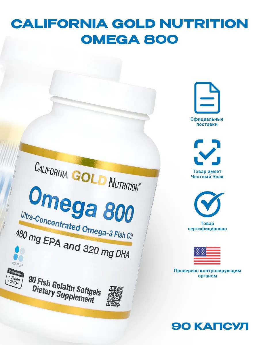 Ультраконцентрированный рыбий жир Omega 800 с омега-3 California Gold Nutrition содержит рыбий жир, который очищается и перерабатывается в Германии в соответствии с высочайшими отраслевыми стандартами. Этот рыбий жир премиум-класса содержится в мягких желатиновых капсулах, изготовленных в Калифорнии, США.