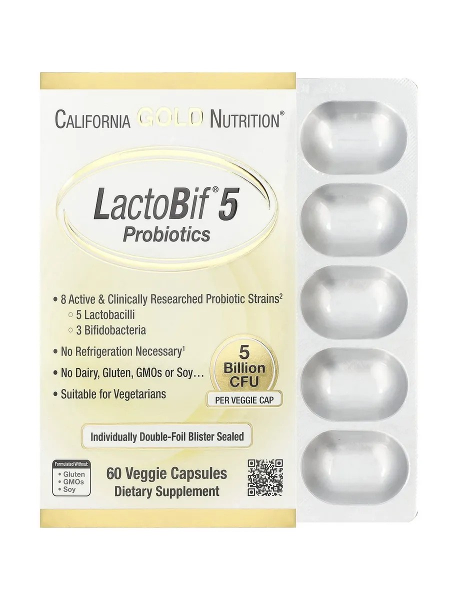 California Gold Nutrition LactoBif 5 Probiotics, 5 Billion CFU, 60 Veggie Capsules - contain 8 active and clinically active strains of probiotics: 5 types of lactobacilli and 3 types of bifidobacteria. The advantage of probiotics, packaged in individual blisters with a double layer of foil, is optimal protection from oxygen, moisture, light, product integrity and safety, protection from opening, and the possibility of long-term storage at room temperature without the need for refrigeration.