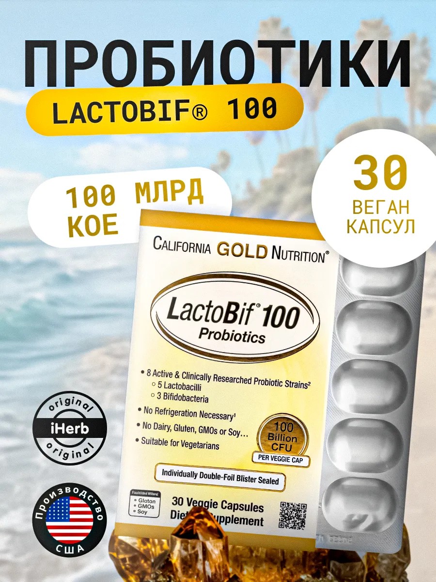 LactoBif 100 от California Gold Nutrition — это мощный пробиотический комплекс с высокой концентрацией живых культур. Каждая капсула содержит 100 миллиардов КОЕ и включает 8 тщательно подобранных штаммов пробиотиков, поддерживающих здоровье пищеварительной системы и иммунитет.