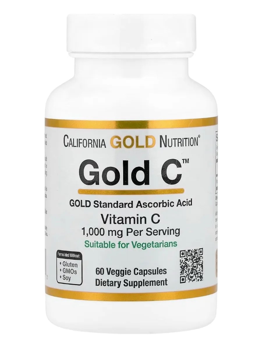 .Витамин C Gold C от California Gold Nutrition содержит витамин C класса USP (в виде аскорбиновой кислоты) в вегетарианских капсулах. Эта добавка подходит для вегетарианцев и не содержит глютена, ГМО и сои.