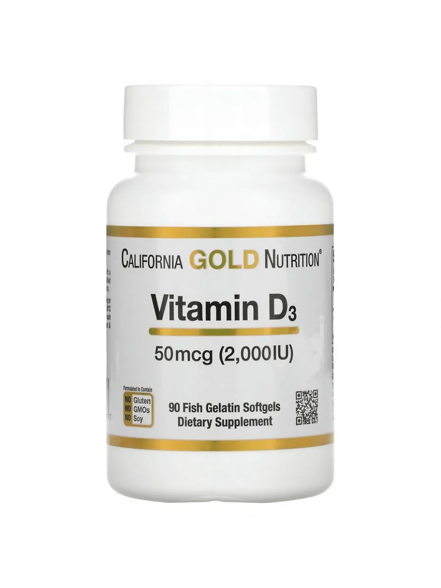 Vitamin D3 California Gold Nutrition 50 mcg (2,000 IU) is a biologically active supplement that helps maintain the health of the immune system, bones, and teeth. Not a drug (dietary supplement). Each capsule contains 2,000 IU (50 mcg) of vitamin D3 (cholecalciferol from lanolin). Other ingredients: Non-GMO safflower oil, capsule shell (tilapia fish gelatin, non-GMO vegetable glycerin, purified water). Sealed for your protection. Do not use if seal is missing or damaged. Best stored at controlled room temperature (20 to 25 C). Vitamin D is an essential vitamin for many metabolic processes. Vitamin D3 helps regulate the absorption of calcium and phosphorus, and supports healthy immune system function. Before taking dietary supplements, consult a physician or other qualified healthcare professional.