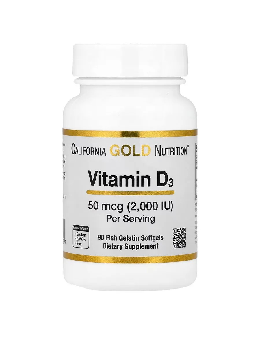 Витамин D3 (50 мкг / 2000 МЕ) от California Gold Nutrition — это добавка с витамином D в виде холекальциферола в капсулах из рыбьего желатина.