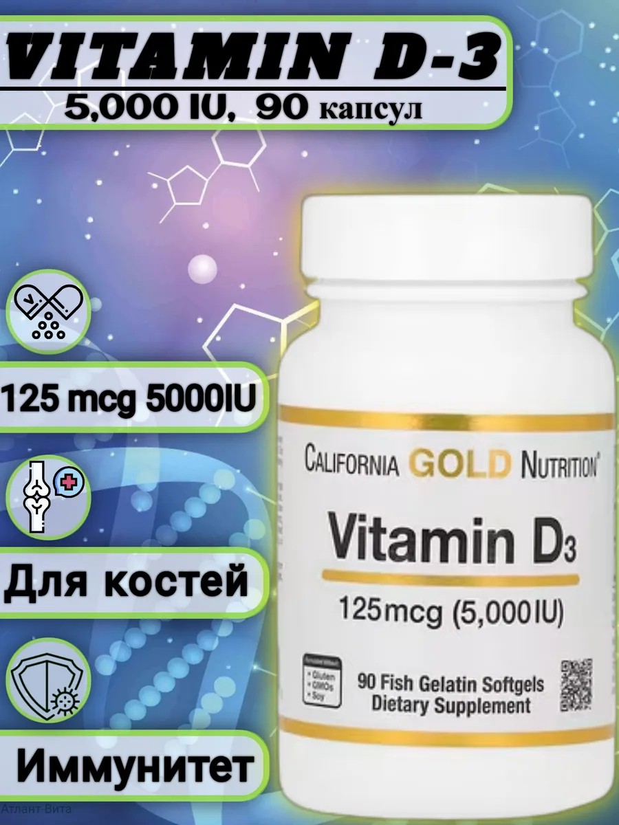 Витамин D3 (125 мкг / 5т МЕ) от California Gold Nutrition — это добавка с витамином D в виде холекальциферола в капсулах из рыбьего желатина.