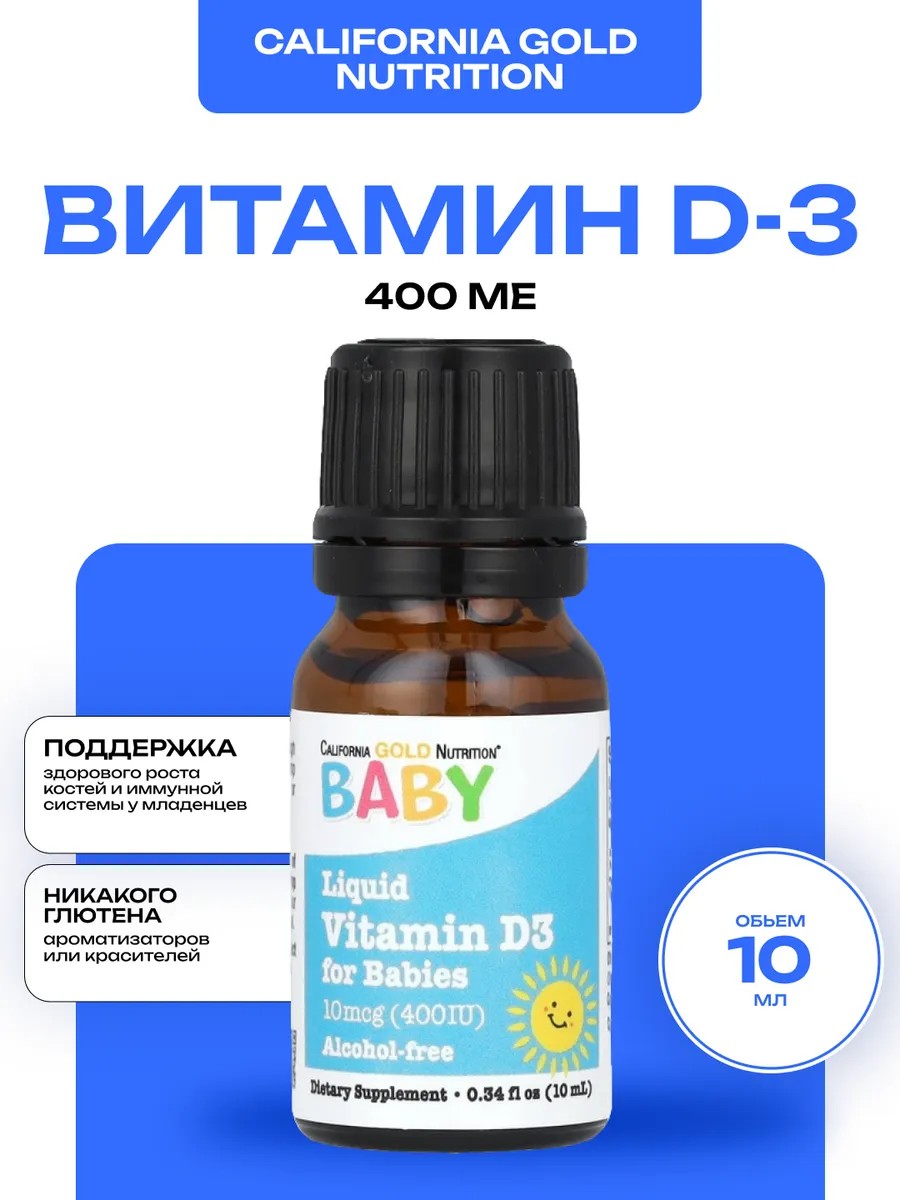 California Gold Nutrition Baby D3 400 МЕ – это высококачественная пищевая добавка с витамином D3, предназначенная специально для младенцев и детей. Бад Витамин D3 для детей способствует нормальному развитию костей и зубов, а также поддерживает здоровье иммунной системы. Каждая порция содержит 400 международных единиц (МЕ) витамина D3, что соответствует рекомендациям по поддержанию оптимального уровня этого витамина у детей. Формула витаминного комплекса разработана с учетом потребностей малышей и направлена на обеспечение их здоровья в первые месяцы жизни.Продукт не содержит искусственных красителей, консервантов и ГМО, что делает его безопасным выбором для самых маленьких. Удобная упаковка с пипеткой позволяет легко дозировать добавку, а нейтральный вкус делает ее прием комфортным для ребенка. California Gold Nutrition Baby D3 – это надежный способ поддержать рост и развитие вашего малыша с первых дней жизни.