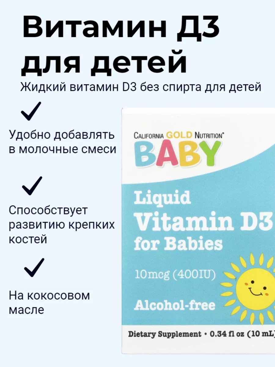 Витамин D3 для детей от California Gold Nutrition содержит холекальциферол (витамин D3) из ланолина в виде удобной жидкой добавки. Эта добавка не содержит глютена, ГМО и спирта, а также подходит для вегетарианцев.
