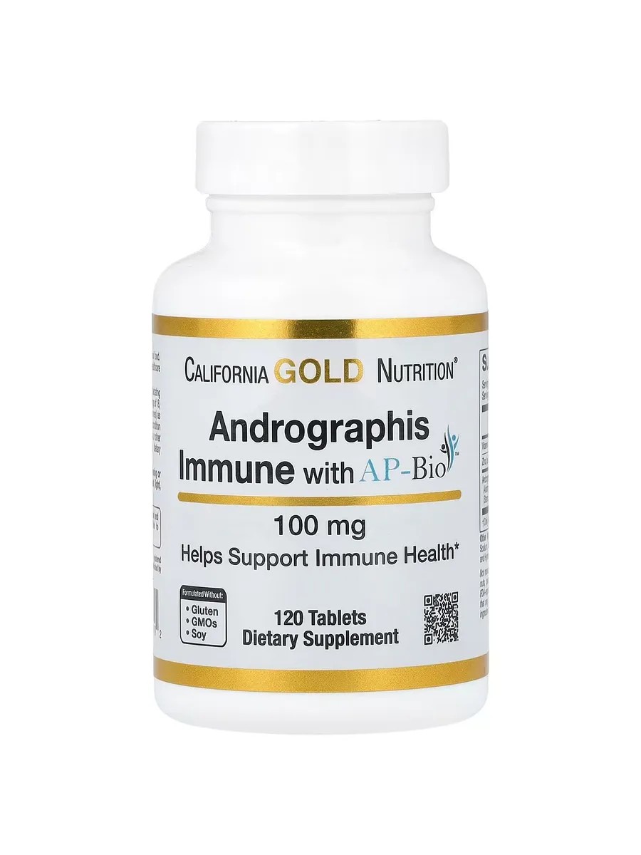 Добавка для укрепления иммунитета с экстрактом андрографиса AP-Bio от California Gold Nutrition содержит смесь витаминов, минералов и трав для поддержки здоровья иммунной системы и хорошего самочувствия в сезон простуд. Средство содержит клинически протестированную и быстродействующую форму экстракта листьев андрографиса (Andrographis paniculata), стандартизированного до 30% андрографолида.