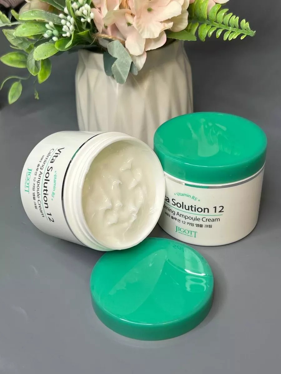 JIGOTT Vita Solution 12 Calming Ampoule Cream with natural sources of vitamin B5 soothes the skin, softens and restores the epidermis, and can smooth out the first wrinkles. This soothing cream restores a healthy moisture balance in skin cells and improves elasticity thanks to plant extracts. Suitable for people with irritated skin. It has an anti-inflammatory and soothing effect, promoting healing and regeneration of the skin. Restores a healthy moisture balance in cells, improves skin elasticity, smoothes fine wrinkles, and controls sebum production. Directions: Apply a small amount of cream to a cleansed face and neck, gently patting it into the skin.