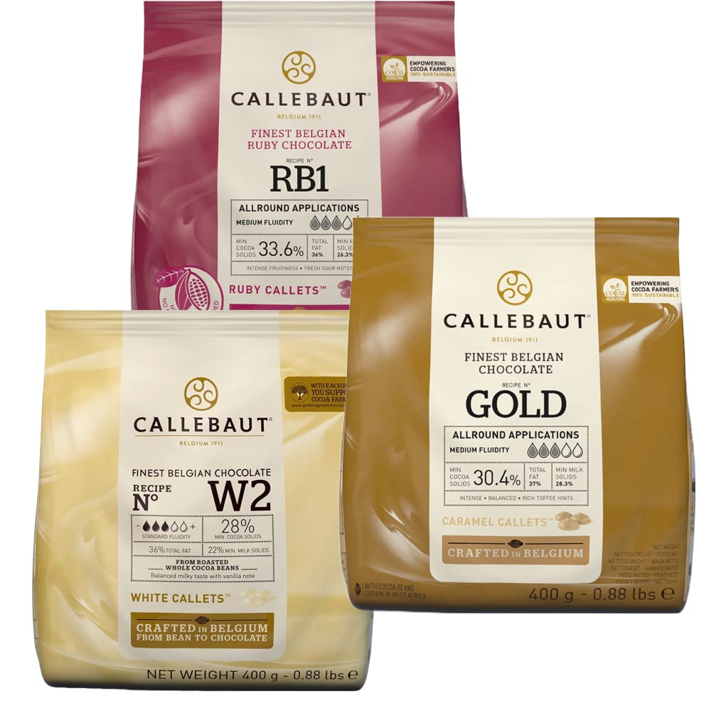 Three of Callebaut's most popular chocolates in a kit. 400g of white, ruby, and golden chocolate. RB1 Ruby Chocolate: Intense fruit flavor with slightly acidic notes, the fourth type of chocolate in the latest generation, versatile and with an appealing color. Golden Caramel Chocolate: Balanced caramel chocolate with a rich note of caramel, butter, and cream, and an exciting touch of salt. W2 White Chocolate: It has a smooth taste with perfectly balanced milky, creamy, caramel, and vanilla notes. All three are perfect for chocolates, chocolate bars, pastries, ganache, or simply enjoying on their own. They are also incredibly delicious in hot chocolate. You'll always have a small supply of chocolate at home. This chocolate is very special and made exactly for those who want to create their own masterpieces. Ingredients: Sugar, cocoa butter, skimmed milk powder, whole milk, cocoa mass, emulsifier: soy lecithin, acid: citric acid, natural vanilla flavoring, minimum 33.6 cocoa solids. Gold content: Cocoa butter, sugar, milk powder, milk sugar, whey powder (milk), skimmed milk powder, caramelized sugar (2 ), emulsifier: soy lecithin, natural vanilla flavoring, salt, At least 30.4 cocoa solids. White content: Sugar, cocoa butter, whole milk powder, emulsifier: soy lecithin, natural vanilla flavoring. At least 28 cocoa solids. Nutritional information: Serving size 100g: Energy (kJ): 2237 kJ Energy (kcal): 534 kcal Fat: 36.1 g Of which: Saturated fatty acids: 22.7 g Monounsaturated fatty acids: 12.2 g Polyunsaturated fatty acids: 1.3 g Carbohydrates: 46.8 g Of which: Sugars: 43.5 g Fiber: 7.2 g Protein: 5 g Sodium: 6 mg INGREDIENTS Cocoa mass, sugar, cocoa butter, emulsifier: soy lecithin, natural vanilla flavoring. May contain traces of milk. At least 54.5 cocoaCallebaut Coffret Chocolat 3x400g (Ruby, Blanc et Or) Chocolat BelgeDESCRIPTION DU PRODUIT DESCRIPTION DU PRODUIT Trois des chocolats les plus populaires de Callebaut en kit. 400 g de chocolat blanc, rubis et doré. N RB1 Chocolat Ruby : saveur intense de fruits avec des notes légèrement acides, le quatrième type de chocolat de dernière génération, polyvalent et de couleur séduisante. Chocolat caramel doré N : chocolat caramel équilibré avec une riche note de caramel, de beurre et de crème et une pincée de sel passionnante N W2 chocolat blanc : il a un goût doux avec des notes laiteuses, crémeuses, caramelles et vanillées parfaitement équilibrées. Les trois sont parfaits pour les chocolats, les tablettes de chocolat, la pâtisserie, la ganache ou tout simplement pour manger comme ça. Ils sont également super délicieux dans un chocolat chaud. Vous aurez toujours un petit stock de chocolat dans la maison. Ce chocolat est très spécial et fait exactement pour ceux qui veulent réaliser leurs créations. Contenu : sucre, beurre de cacao, lait écrémé en poudre, lait entier, pâte de cacao, émulsifiant : lécithine de soja, acidifiant : acide citrique, arôme naturel de vanille, minimum 33,6 de cacao. Contenu en or : beurre de cacao, sucre, lait en poudre, sucre de lait, lactosérum en poudre (lait), lait écrémé en poudre, sucre caramélisé (2 ), émulsifiant : lécithine de soja, arôme naturel de vanille, sel, Au moins 30,4 de cacao. Contenu blanc : sucre, beurre de cacao, lait entier en poudre, émulsifiant : lécithine de soja, arôme naturel de vanille. Au moins 28 de cacao. Informations nutritionnelles : Taille de la portion 100 g : Énergie (kJ) 2237 kJ Énergie (kcal) : 534 643 kcal. Graisse : 36,1 g. Dont : Acides gras saturés : 22,7 g. Acides gras monoinsaturés : 12,2 g. Acides gras polyinsaturés : 1,3 g. Glucides : 46,8 g. Dont : Sucre 43,5 grammes Fibres : 7,2 g. Protéines : 5 g. Sodium 6 milligrammes. INGRÉDIENTS Pâte de cacao, sucre, beurre de cacao, émulsifiant : lécithine de soja, arôme naturel de vanille. Peut contenir des traces de lait au moins 54,5 de cacao