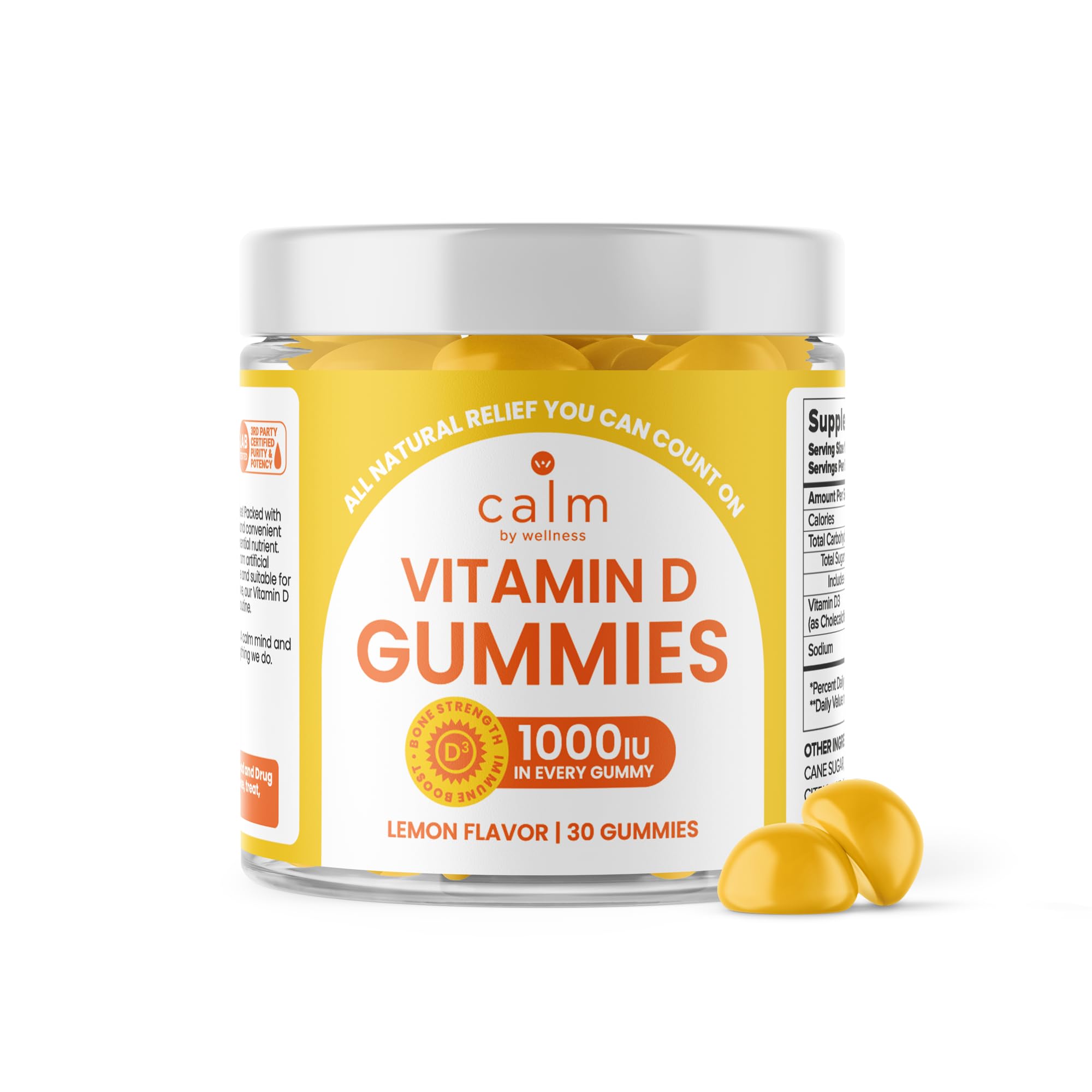 ALL-IN-ONE DAILY VITAMIN BOOST: One 30 count bottle of Calm by Wellness Vitamin D3 Gummy Vitamins, lemon flavored supplements, enough Vitamin D gummies for 30 days. This convenient dosage ensures you receive essential nutrients consistently, supporting bone health and overall wellness with every delightful bite. DELICIOUS LEMON FLAVOR: These delicious Vitamin D gummies are made with natural lemon flavor, have a satisfying chewy texture and are a great alternative to traditional vitamin pills that are hard to swallow. NO JUNK OR ALLERGENS: Our D3 Vitamin is made of real organic fruit with no added sugar, syrups, sweeteners, synthetic vitamins, gelatin, artificial ingredients and colorings. This vitamin is also plant based, vegan, and contains no peanuts, tree-nuts, corn, gluten, soy, dairy, eggs, or shellfish. VEGAN VITAMIN D: No need to rely on animal-based or synthetic vitamin D supplements, our Vitamin D3 comes from vegan-friendly Lichen, for high absorption. D3 VITAMINS: Introducing Calm by Wellness Vitamin D3 Lemon Flavored Gummies — formulated to support healthy bones, immune health and overall wellness. Each gummy contains 1000 IU Vitamin D3, 100 Vegan Gummies for men and women.