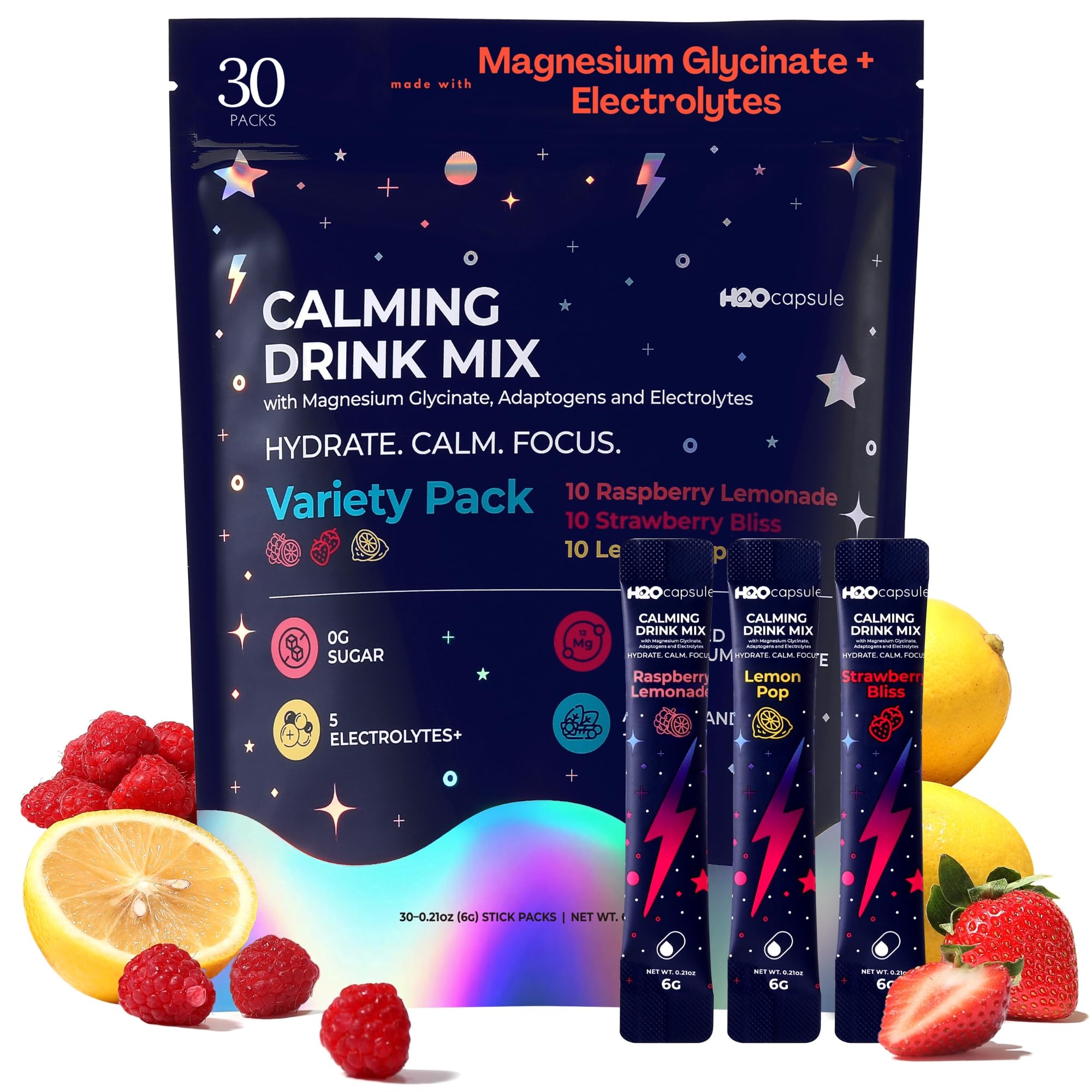 Calm Magnesium Glycinate Powdered Drink Mix with Electrolytes Sugar Free with Ashwagandha, L-Theanine, Vitamin B6 & GABA Cortisol Support, Stress Relief, Hydration & Focus - 30 servings (Variety) Variety Pack 6.3 Ounce