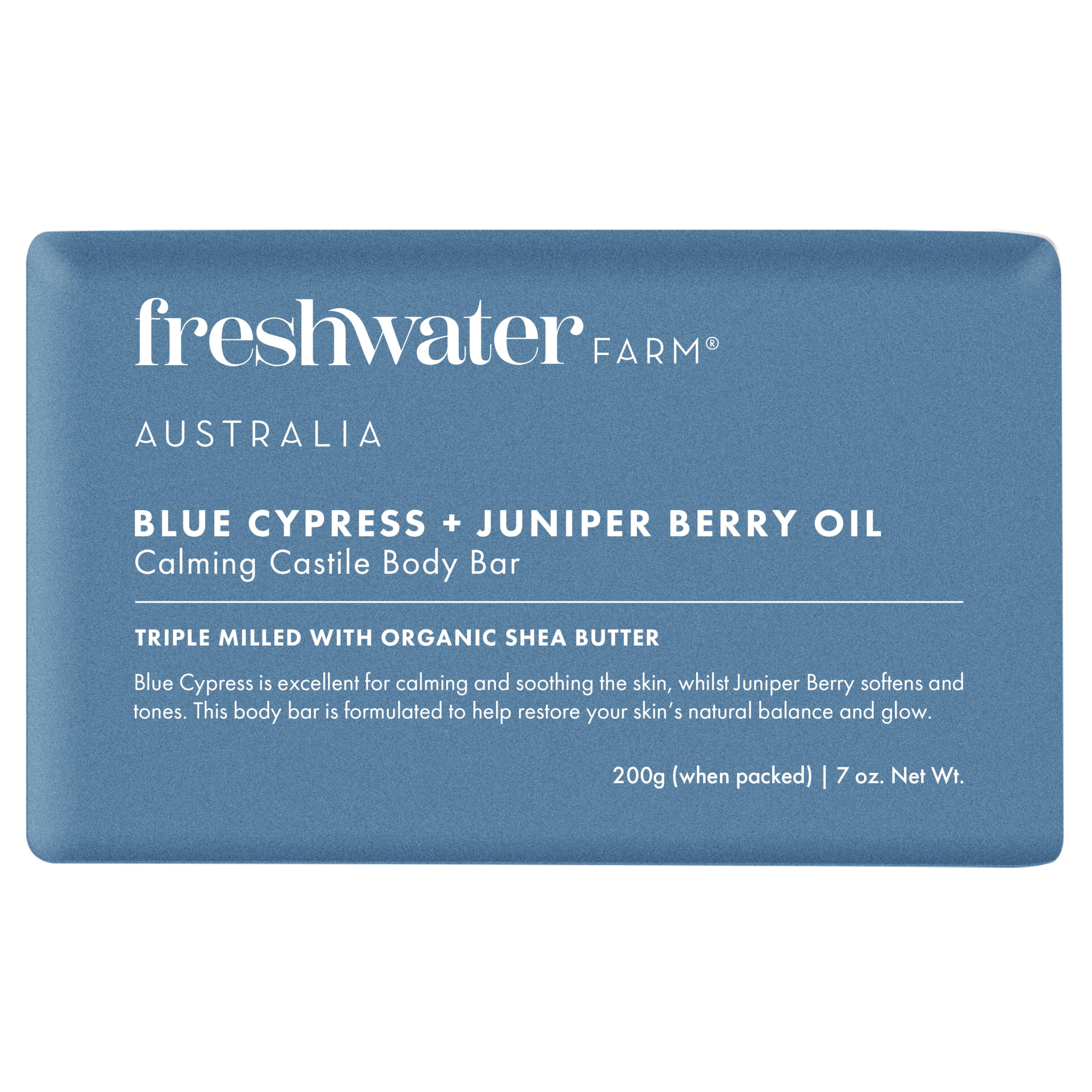200g / 7.05Oz. ? Naturally Derived ? Triple-Milled ? Gentle on sensitive skin ? Vegan friendly ? Australian Made + Family Owned. Freshwater Farm’s traditionally triple-milled soap bars are made with only the finest natural ingredients. Each Body Bar is carefully made with Australian Olive Oil and Shea Butter to create a creamy lather that is rich in moisture. Blue Cypress is excellent in helping calm and soothe irritated skin, while Juniper Berry is a natural skin toner. This Body Bar will act as a skin tonic and will help to restore your skin’s natural balance and glow.