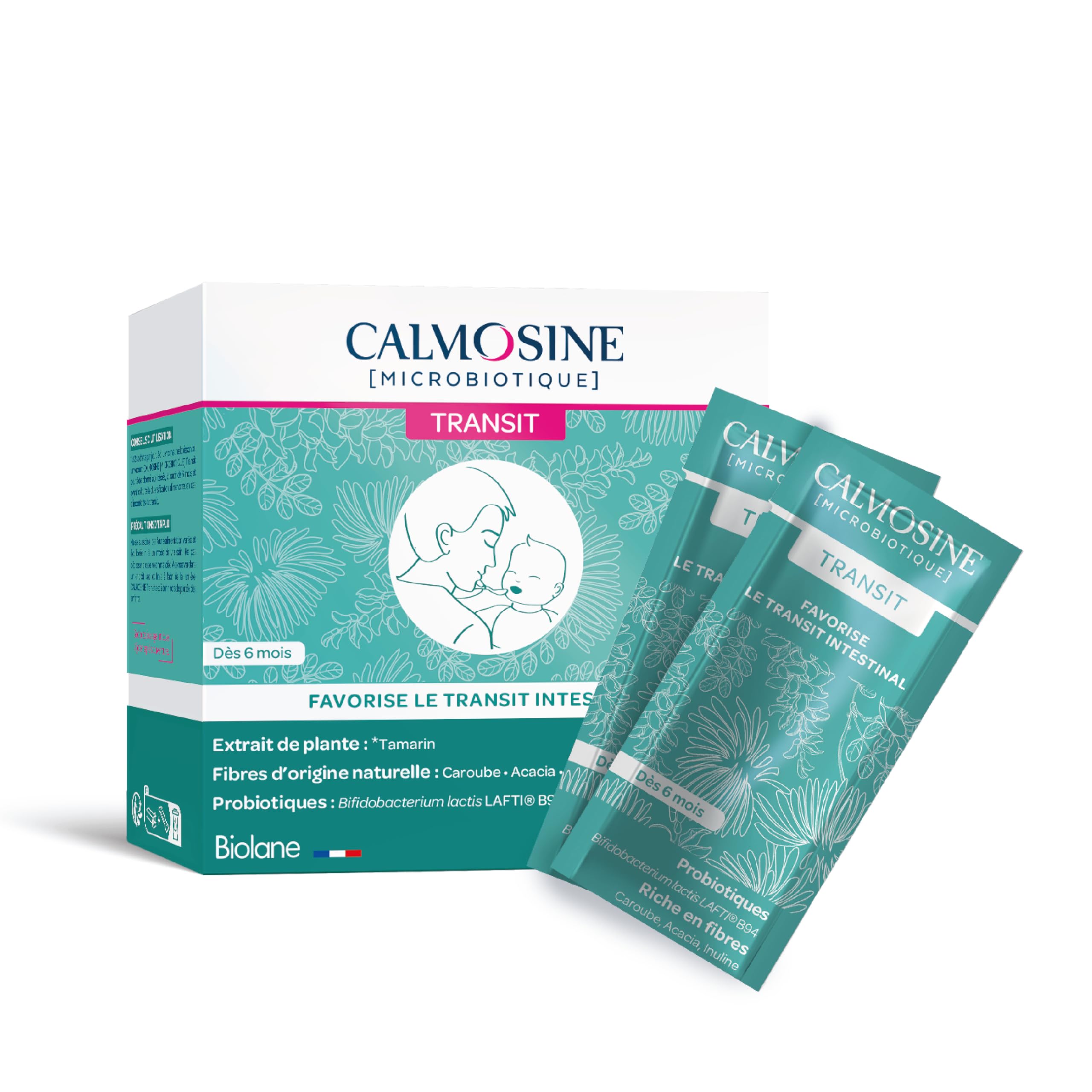 : Calmosine Transit is a natural food supplement specifically designed to promote your baby's intestinal transit. During the introduction of solid foods, some babies may experience minor digestive discomfort such as constipation or slow transit. Thanks to its complete and gentle formula, Calmosine Transit helps to quickly and lastingly relieve transit issues. A 2-in-1 action: the natural fibers in Calmosine Transit (carob, acacia, inulin) gently relieve constipation, and the probiotic strain Bifidobacterium lactis LAFTI B94 helps strengthen and balance the intestinal microbiota. Together, these natural active ingredients effectively support your baby's intestinal flora, promote better digestion, and help relieve mild constipation. A box of 20 convenient sachets for easy dilution, perfect for on-the-go use and with a neutral taste. This food supplement can be easily incorporated into your baby's daily diet: during a meal or snack, mixed into fruit puree or yogurt. It is preservative-free, additive-free, and colorant-free, respecting the sensitivity of infants and young children. Made in France, Calmosine Transit was developed in collaboration with healthcare professionals: pediatricians, midwives, and phytotherapy experts. Its natural, carefully measured formula meets the specific needs of infants and young children. Ingredients: Acacia gum (Acacia seyal), inulin, maltodextrin, Bifidobacterium lactis LAFTI B94, carob gum (Ceratonia siliqua), tamarind extract (Tamarindus indica)MADE IN FRANCE: Calmosine Transit food supplement is made in France with 100 natural active ingredients and probiotics. This solution was formulated with pediatric gastroenterologists and phytotherapy experts. DIRECTIONS FOR USE: Calmosine Transit food supplement is intended for babies who have started weaning. At the first signs of constipation, dissolve 1 to 2 sachets per day, during a meal or snack, in applesauce or yogurt. PRESERVES THE MICROBIOTA: Calmosine Transit acts on your baby's intestinal microbiota thanks to a targeted and recognized probiotic strain: Bifidobacterium lactis LAFTIB94. Its long-term action helps to maintain a balanced gut flora. RELIEVES CONSTIPATION: When your baby shows signs of constipation, Calmosine Transit acts quickly to facilitate bowel movements. It facilitates digestion thanks to its optimal intake of natural fibers: carob, inulin, acacia, and tamarind. CALMOSINE TRANSIT: The Calmosine Transit food supplement is a natural and gentle solution that quickly relieves constipation and preserves the intestinal microbiota. Its formula, based on fibers and a probiotic strain, helps to regulate your baby's digestion in the long term.Description du produit Calmosine Transit est un complément alimentaire naturel spécifiquement conçu pour favoriser le transit intestinal de votre bébé. Lors de la diversification alimentaire, certains bébés peuvent souffrir de petits désagréments digestifs comme la constipation ou un transit ralenti. Grâce à sa formule complète et douce, Calmosine Transit aide à soulager rapidement et durablement le transit. Une action 2 en 1 : les fibres naturelles de Calmosine Transit (caroube, acacia, inuline) soulage la constipation en douceur, et la souche probiotique Bifidobacterium lactis LAFTI B94 contribue à renforcer et équilibrer le microbiote intestinal. Ensemble, ces actifs naturels soutiennent efficacement la flore intestinale de votre bébé, favorisent une meilleure digestion et aident à soulager la constipation légère. Une boîte de 20 sachets pratiques à diluer, nomade et neutre en goût. Ce complément alimentaire s'intègre facilement à l'alimentation quotidienne de bébé : lors d'un repas ou d'un goûter, dans une compote ou un yaourt. Il est sans conservateurs, sans additifs ni colorants, pour respecter la sensibilité des tout-petits. Fabriqué en France, Calmosine Transit a été développé en collaboration avec des professionnels de santé : pédiatres, sages-femmes et experts en phytothérapie. Sa formulation naturelle, bien dosée, respecte les besoins spécifiques des nourrissons et jeunes enfants. Ingrédients Gomme dacacia (Acacia seyal), inuline, maltodextrine, Bifidobacterium lactisLAFTI B94, gomme de caroube (Ceratonia siliqua), extrait de tamarin (Tamarindus indica)FABRICATION FRANÇAISE : Le complément alimentaire Calmosine Transit est fabriqué en France avec des actifs 100 d'origine naturelle et des probiotiques. Cette solution a été formulée avec des gastro-pédiatres et des experts en phytothérapie. CONSEILS D'UTILISATION : Le complément alimentaire Calmosine Transit est destiné aux bébés ayant commencé la diversification alimentaire. Dès les premiers signes de constipation, diluez 1 à 2 sachets par jour, lors d'un repas ou d'un goûter, dans une compote ou un yaourt. PRESERVE LE MICROBIOTE : Calmosine Transit agit sur le microbiote intestinal de votre bébé grâce à une souche probiotique ciblée et reconnue : Bifidobacterium lactis LAFTIB94. Son action de fond permet d'équilibrer durablement sa flore intestinale. SOULAGE LA CONSTIPATION : Lorsque votre bébé présente des signes de constipation, Calmosine Transit agit rapidement sur l'évacuation des selles. Il facilite le transit grâce à son apport optimal en fibres naturelles : caroube, inuline,acacia, tamarin. CALMOSINE TRANSIT : Le complément alimentaire Calmosine Transit est une solution naturelle et douce qui soulage rapidement la constipation et préserve le microbiote intestinal. Sa formule à base de fibres et souche probiotique aide à réguler le transit de votre bébé durablement.Calmosine - Microbiotique Transit - Complément alimentaire bébé - Améliore le transit intestinal - 20 sachets - Dès 6 mois - Fabriqué en France