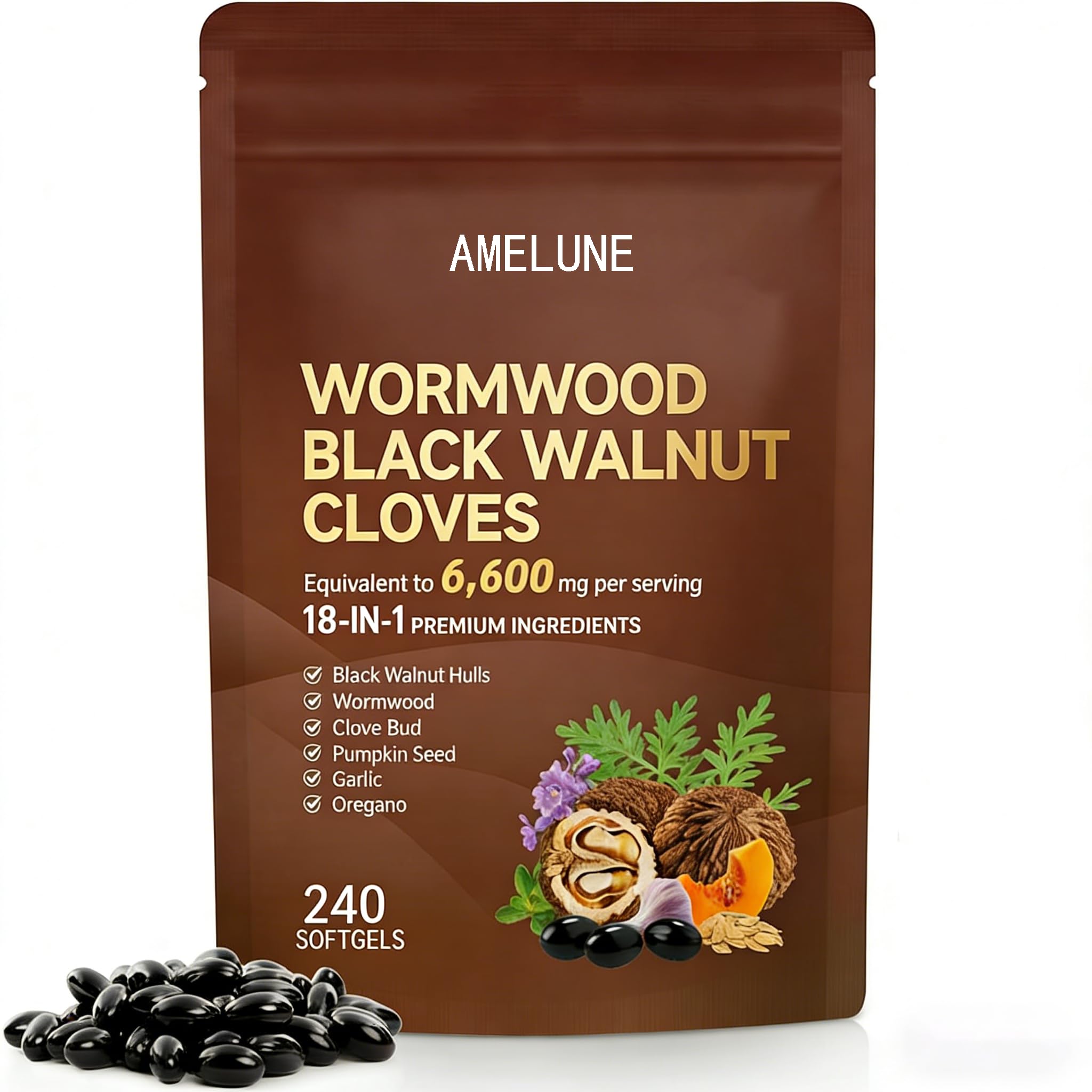 CALMTIVA AMELUNE Premium Wormwood & Black Walnut Supplement - 18-in-1 Herbal Blend 6600mg Serving Digestive Support 240 Softgels