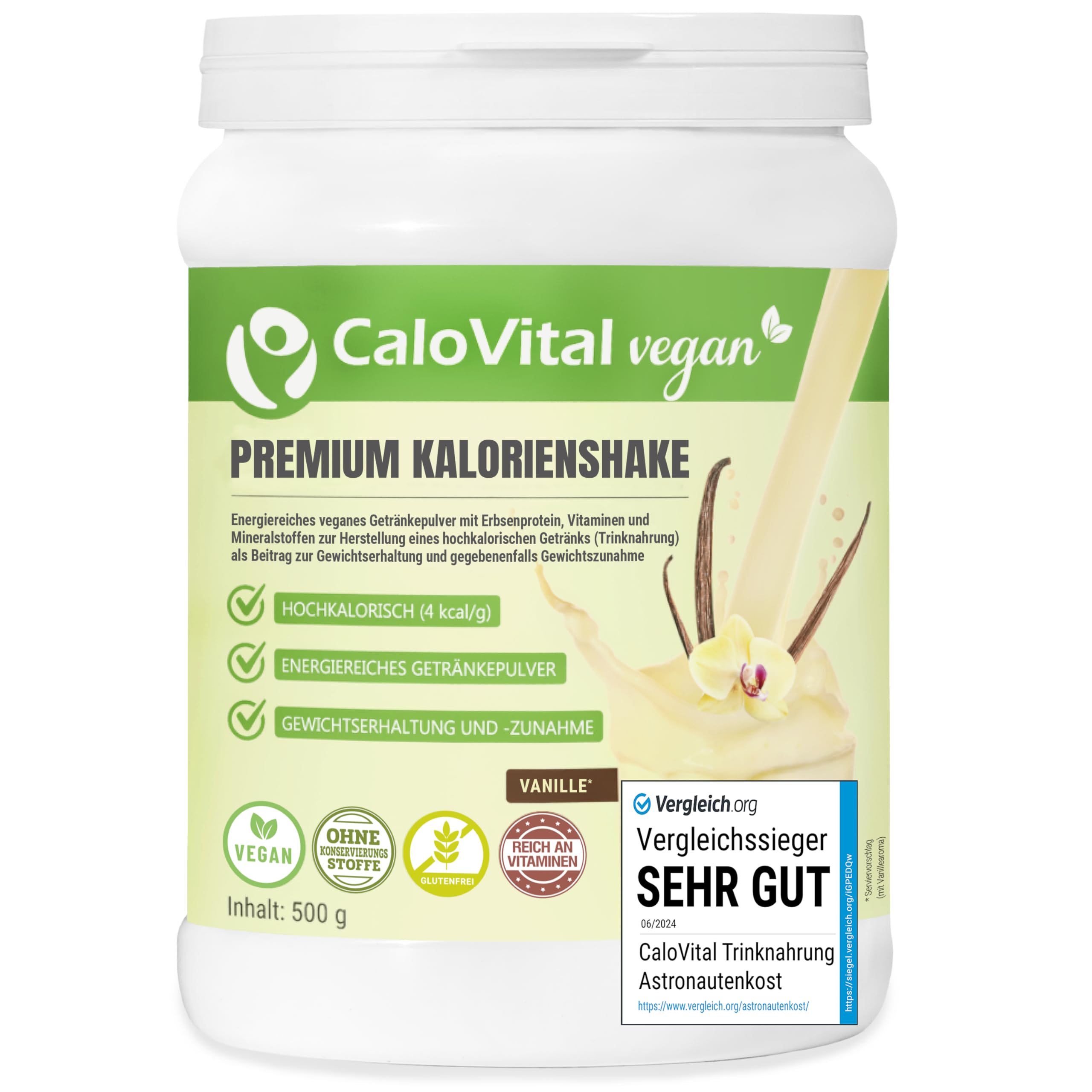 CALOVITAL – The premium calorie shake. Ask your pharmacist. CaloVital is a recovery food. CaloVital is formulated as a vegan food and can be used for various purposes. High-level athletes who need a lot of energy and want to replenish their reserves after training use this vegan calorie shake. But underweight individuals who need to gain weight also benefit from a high-calorie vegan diet. Furthermore, CaloVital Weight Gainer is an ideal vegan food for older adults. Therefore, this high-calorie powder is particularly suitable for people over 40 who can no longer utilize food optimally or suffer from a loss of appetite. In cases of malnutrition or nutrient deficiencies, CaloVital acts like a food for astronauts. Enriched with vitamins and nutrients, CaloVital provides the body with many essential elements. If you're looking for a high-calorie weight-gain supplement, then the CaloVital shake is the right choice. Delicious flavors. The Dervegan shake is available in many different flavors. This ensures a varied calorie intake. Vegan supplement for seniors and athletes. A variety of uses are possible for the shake. The high-calorie CaloVital drinkable supplement can be easily administered as a liquid, even at an advanced age and with a reduced appetite. For athletes who expend a lot of calories through intense training and need plenty of energy, the high-calorie weight-gain shake helps replenish their energy. This helps prevent cravings and the consumption of unhealthy foods. Get creative with CALOVITAL CaloVital can be combined with a variety of drinks and foods. Mix CaloVital into coffee, soups, fruit juices, milk, or yogurt, for example, to significantly increase your calorie intake. Creativity knows no bounds when it comes to creating exceptionally delicious, high-energy treats. Benefits: Vegan, gelatin-free, preservative-free, sweetener-free, aspartame-free, egg-free, nut-free, yeast-free, gluten-free, highly bioavailable, and made in Germany. Allergy warning: soy INGREDIENTS maltodextrin, sugar, pea protein isolate, soy lecithin, flavoring, tripotassium citrate, thickener (guar gum), calcium carbonate, magnesium oxide, ferrous pyrophosphate, zinc oxide, selenium yeast, ascorbic acid (vitamin C), niacinamide, DL-alpha-tocopherol acetate (vitamin E), D-calcium oxide (panthenic acid), riboflavin (vitamin B2), pyrodoxine hydrochloride (vitamin B6), thiamine hydrochloride (vitamin B1), folic acid, biotin, methylcobalamin (vitamin B12), manganese sulfate, copper gluconate, sodium iodine, vitamin A (retinyl acetate), vitamin D3 (cholecalciferol). DIRECTIONS FOR USE The CaloVital shake is a high-calorie drinkable food. CaloVital is formulated as a building block food and can be used for various purposes. SAFETY WARNING Allergy Advice: Soy Lecithin MANUFACTURER INFORMATION KAP3 55116 Premium Quality Product UG Limited Liability Grand Blanch 30 Mainz, AT See moreCaloVital Aliment à boire, hautement calorique, à boire, végétalien, à boire, pour astronaute, avec glucides, protéines, vitamines et minéraux, hautement dosé, 500 g, vanille vanille.DESCRIPTION DU PRODUIT DESCRIPTION DU PRODUIT CALOVITAL – Le shake calorique de qualité supérieure. Demandez au pharmacien de votre confiance. CaloVital est un aliment de reconstruction . CaloVital est préparé comme aliment végétalien et peut être utilisé à des fins différentes. Les athlètes de haut niveau qui ont besoin de beaucoup d'énergie et qui veulent reconstituer les réserves après l'entraînement utilisent le shake calorique végétalien. Mais les personnes souffrant d'insuffisance pondérale qui doivent prendre du poids bénéficient également d'un régime hautement calorique végétalien. En outre, le Weight Gainer CaloVital est un aliment végétalien idéal pour les personnes âgées. C'est pourquoi la poudre hautement calorique est particulièrement adaptée aux personnes âgées de plus de 40 ans qui ne peuvent plus utiliser les aliments de manière optimale ou souffrent de perte d'appétit. En cas de malnutrition, en cas de manque de nutriments, CaloVital agit comme un aliment pour astronautes. Enrichi en vitamines et nutriments, CaloVital fournit au corps de nombreux éléments dont il a besoin. Si vous cherchez un aliment de croissance à haute teneur en calories à prendre du poids, alors le shake CaloVital est le bon choix. Des saveurs délicieuses. Le milkshake Dervegan est disponible dans de nombreuses saveurs différentes. Cela garantit un apport calorique varié. Médicament végétalien pour les personnes âgées et le sport. Une variété d'utilisations est envisageable pour le shake. La nourriture à boire CaloVital hautement calorique peut être facilement administrée sous forme de liquide, même à un âge avancé et avec peu d'appétit. Les athlètes qui ont une dépense calorique élevée grâce à un entraînement intense et qui ont besoin de beaucoup d'énergie, le shake de prise de poids hautement calorique aide à récupérer leur énergie. Cela permet d'éviter les fringales et l'ingestion d'aliments malsains. Soyez créatif avec CALOVITAL CaloVital peut être combiné avec une variété de boissons et d'aliments. Mélangez CaloVital par exemple dans le café, les soupes, les jus de fruits, le lait ou le yaourt pour augmenter votre apport calorique de plusieurs fois. La créativité n'a pas de limites pour des créations exceptionnellement délicieuses à haute teneur en énergie. Avantages : Végétalien, sans gélatine, sans conservation, sans édulcorant, sans aspartame, sans œuf, sans noix, sans levure, sans gluten, haute biodisponibilité et fabriqué en Allemagne. Indication d'allergie : soja INGRÉDIENTS maltodextrine, sucre, isolat de protéine de pois, lécithine de soja, arôme, citrate tri-potassium, épaississant (gomme de guar), carbonate de calcium, oxyde de magnésium, pyrophosphate ferreux, oxyde de zinc, levure de sélénium, acide ascorbique (vitamine C), niacinamide, acétate d