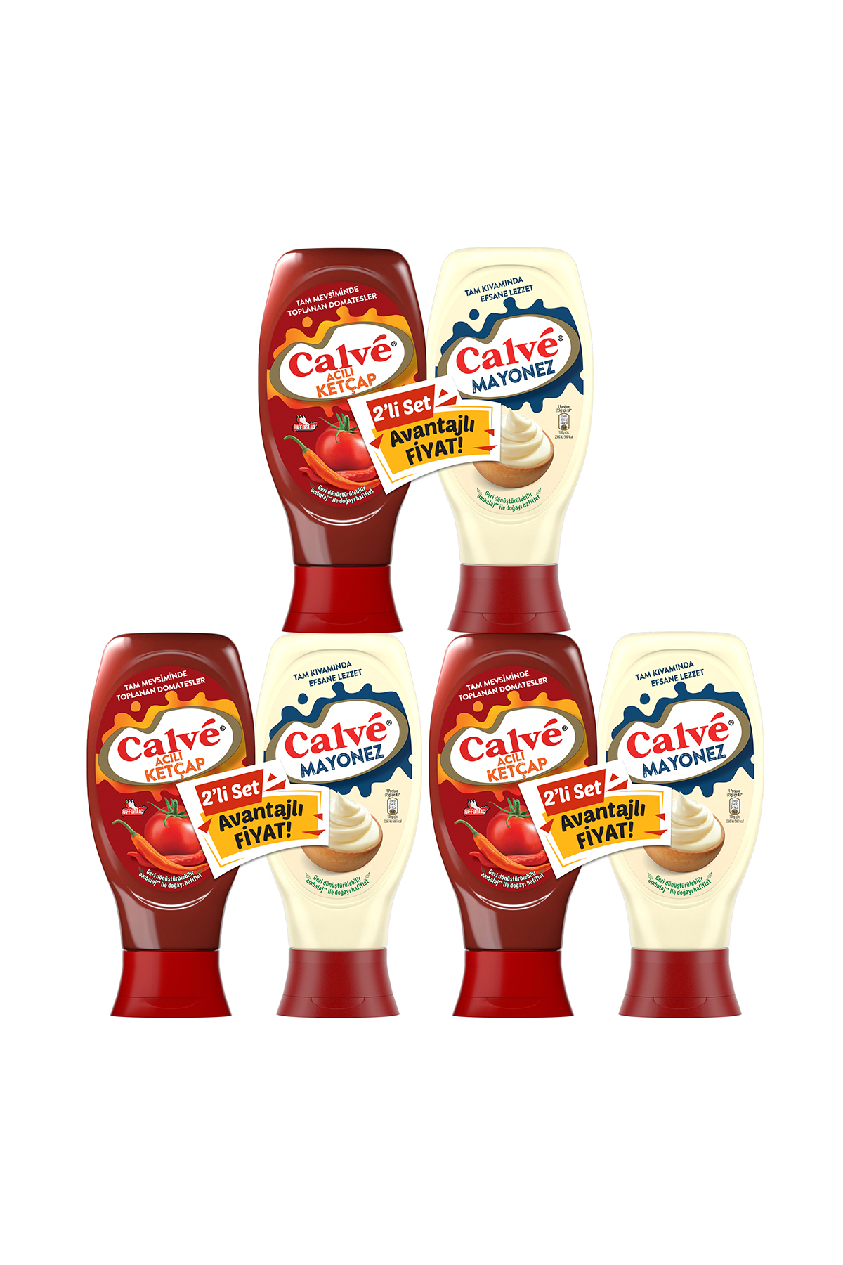 Calve Spicy KetchupThe flavor is just right with Calve!Made from seasonal tomatoes, Calve Spicy Ketchup tastes just the way you want it to. With the delicious flavor of seasonal tomatoes, all your meals are now even more delicious! Meatballs, potatoes, pasta—what if all your favorite dishes could be combined with the Calve flavor of seasonal tomatoes? Try French fries, delicious meatballs, pasta, or any dish you like with Calve Spicy Ketchup. You'll find the flavor you're looking for!If you're one of those who think spicy ketchup brings out the flavor in your meals, Calve Spicy Ketchup is perfect for you. To experience this delicious flavor, all you have to do is open the lid and add the ketchup to your meal! You'll love this ketchup, a favorite of spicy lovers. You'll savor the flavor of seasonal tomatoes to your heart's content. Your favorite pizza or burger will be a perfect match with Calve's spicy ketchup. After all, everything is a perfect match with Calve! This flavor, perfect for fried foods, pastries, and meat dishes, is just the right consistency.Calve's spicy sauces and spicy ketchup will be a favorite among spicy lovers. Each recyclable bottle weighs 400 grams, and you'll be in for a treat. The perfect taste, easy-to-open lid, and delicious tomato aroma are ready to accompany your meals in this recyclable bottle!Capture the amazing flavor with Calve Spicy Ketchup, one of Calve's ketchups.Your meals are now more delicious than ever! Don't forget to store Calve Spicy Ketchup, the source of this delicious flavor, in a cool, dry place.Usage: Store in a cool, dry place.Ingredients: Water, tomato paste, sugar, modified starch, vinegar, salt, apple juice concentrate, preservative (sodium benzoate), natural flavoring: spice (celery), hot red pepper extract.Calve MayonnaiseCalvé, a must-have for the most festive occasions and the perfect accompaniment to entertaining foods, is here with Calvé Mayonnaise, which will add a zest to your meals! The indispensable flavor of mayonnaise, a classic sauce, will elevate the flavor of your dishes to new heights. How? Calvé Mayonnaise, one of the most delicious Calvé mayonnaises, is a perfect sauce for all your meals with its perfect consistency and top-notch flavor. With its appetizing consistency and legendary Calvé flavor, this mayonnaise adds flavor to any dish it accompanies. Calvé Mayonnaise will be a perfect match for all your dishes!Highly acclaimed by consumers, Calvé Mayonnaise will accompany all your dishes with its exceptional flavor, from pizza to potatoes, burgers to salads. A must-have on your table, Calvé Mayonnaise is here to add flavor to the most enjoyable conversations, the most romantic meals, and the most fun gatherings! Dip your potatoes, spray it on pizza, add it to your burger… With Calvé Mayonnaise, you'll savor the flavor of even the most casual meals. Sandwiches, fries, and grills become even more delicious with Calvé Mayonnaise. Perfect for any meal, in any way, Calvé Mayonnaise will add flavor to your most enjoyable moments with its exceptional flavor!Calvé Mayonnaise, with its perfect consistency, adds a perfect flavor to your meals. Its recyclable bottle and cap not only value your palate but also cares for the environment. What's more, all Calvé products are free of lard and additives. Why are you waiting to try Calvé Light Mayonnaise No. 10, 350g, which contains 23 servings? It's a band! Ingredients: Vegetable oil (sunflower, canola, varying amounts), water, egg yolk, sugar, modified starch, salt, vinegar, acidity regulators (citric acid, lactic acid), preservative (sorbic acid), thickener (xanthan gum), colorant (beta carotene), flavorings, antioxidant (calcium disodium EDTA). May contain traces of mustard, celery, milk and dairy products, gluten, and fish products.