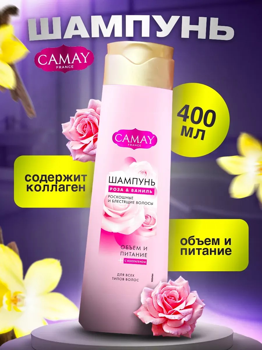 Шампунь Camay для волос. Объем и питание. Новинка для бережного ухода за волосами с чувственным ароматом розы и ванили.