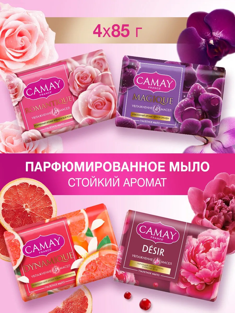 Мыло для рук парфюмированное твердое Camay — это идеальный выбор для тех, кто ценит качество и заботится о своей коже. В комплекте 4 брикета: DÉSIR , Romantique, Динамик и магическое заклинание.