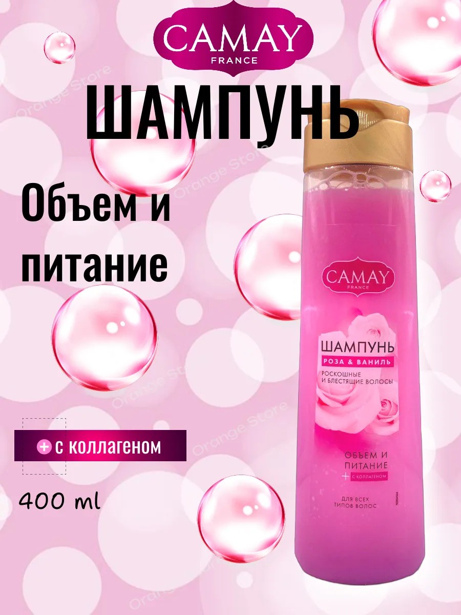 Шампунь Camay для волос. Объем и питание. Новинка для бережного ухода за волосами с чувственным ароматом розы и ванили. Шампунь для объема волос, обогащенный коллагеном, преображает локоны, дарит им сияющий блеск и превращает простую бьюти-рутину в настоящий ритуал заботы о себе.