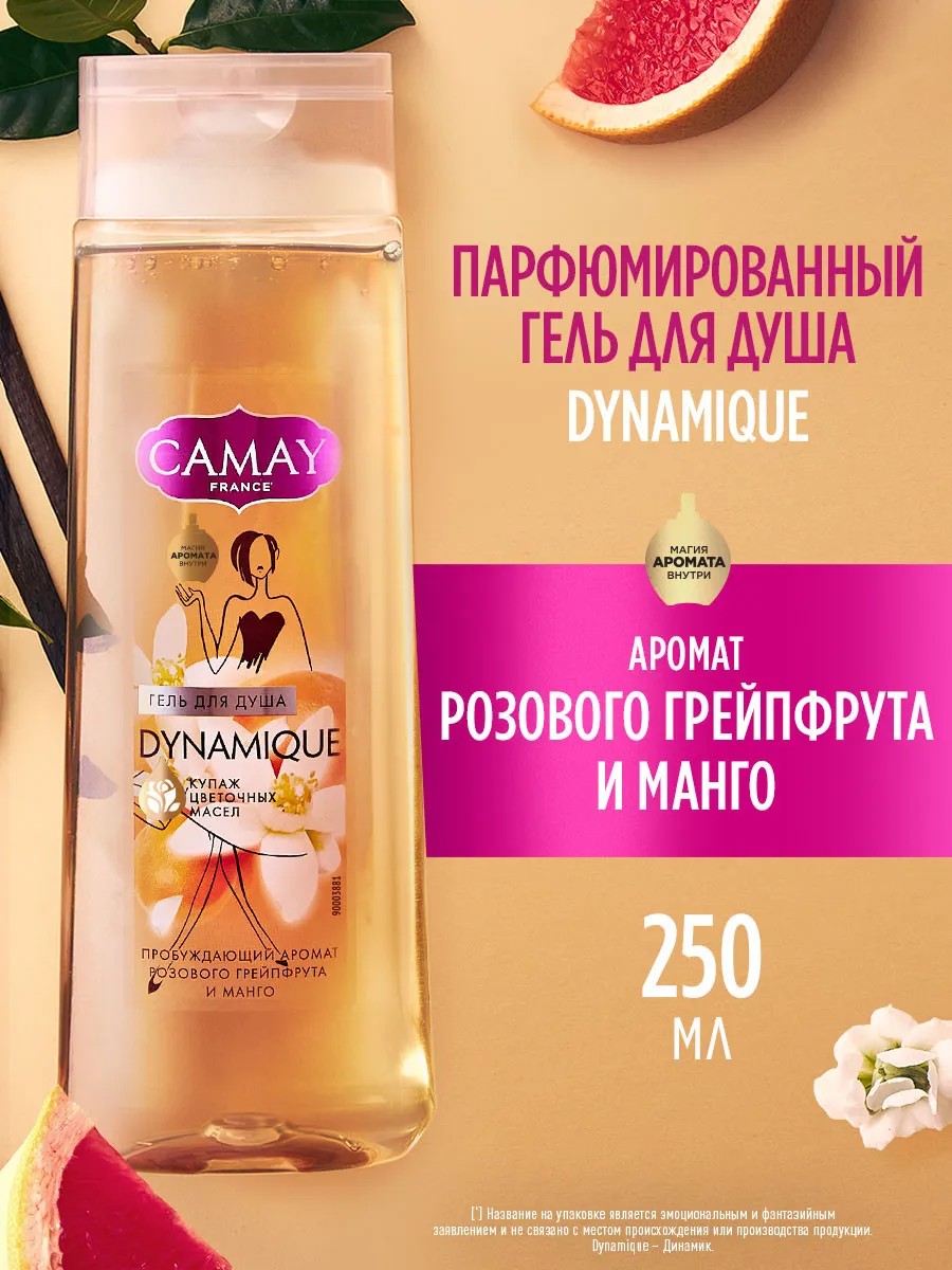 Гель парфюмированный для душа женский Camay Динамик с освежающим ароматом розового грейпфрута пробуждает только приятные эмоции и наполняет энергией на весь день. Попробуйте также гели для душа женские парфюмированные от Camay с запахами цветущего лотоса, французской розы и черной орхидеи.