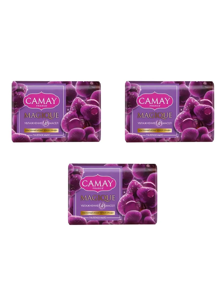Camay Мыло туалетное Magique Орхидея, 85 г, 3 штуки в комплекте. Camay Магическое заклинание твердое мыло с ароматом черной орхидеи подходит для всех типов кожи, деликатно очищает, не сушит кожу. Приятная текстура хорошо вспенивается и полностью смывается водой. Парфюмерная композиция Camay мыла туалетного Магическое заклинание открывается верхними нотами аромата красной смородины, которые плавно переходят в ноты сердца — теплый, глубокий и терпкий запах цветка черной орхидеи. Базовые ноты композиции — сандал и драгоценная амбра — делают аромат очень стойким.