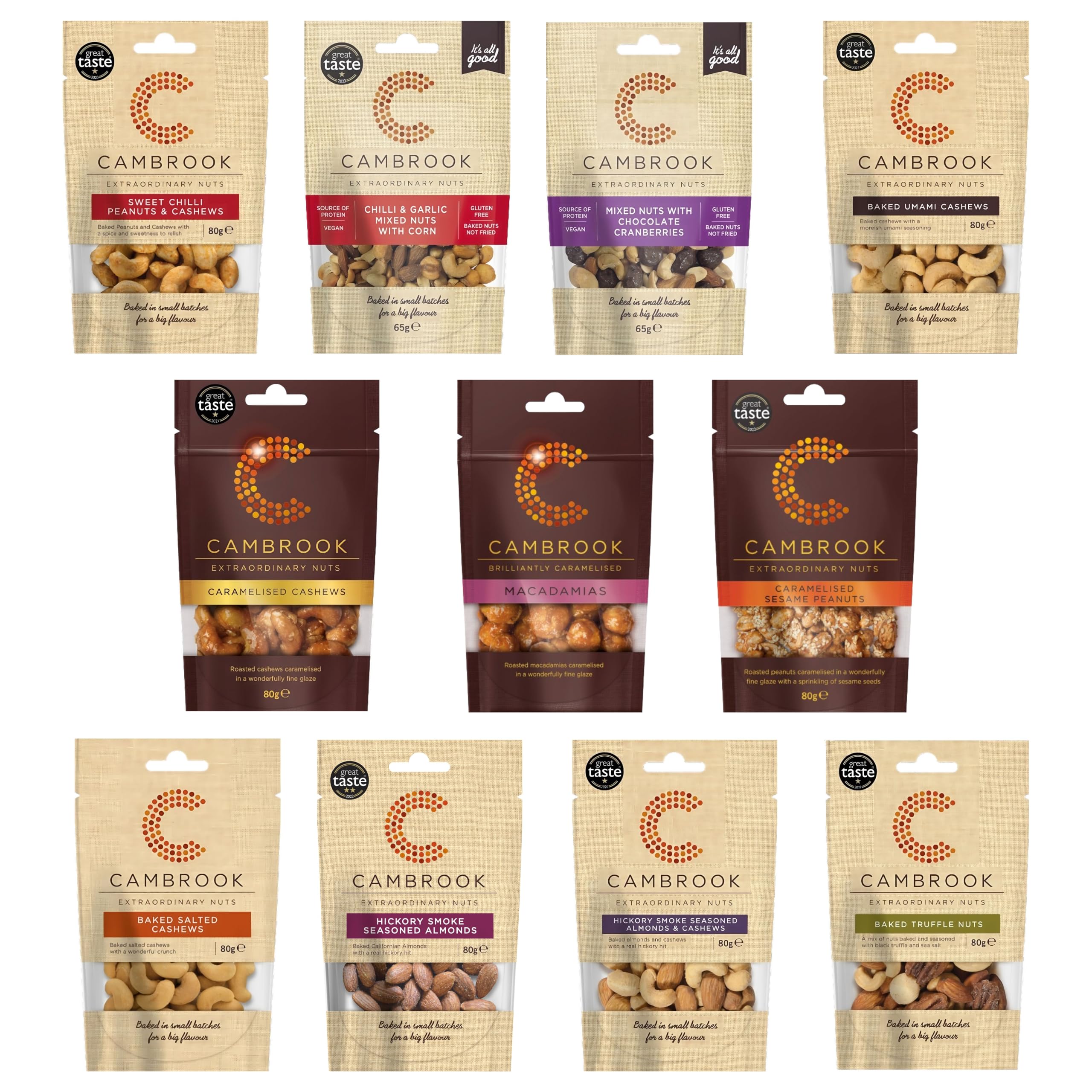 It is Sweet Nutty as CAMBROOK Caramelised Peanuts with Sesame Seeds. It is Protein Powerhouse as CAMBROOK Baked Salted Cashews (80g). It is Gluten-free Vegan as CAMBROOK Salted Cashew Nuts. It is Simple Satisfying as CAMBROOK Salted Cashews (80g). It is Decadent Snack as Caramelised Cashews by CAMBROOK. It is CAMBROOK Caramelised Cashews as Roasted in Small Batches. It is Protein-Packed Snack as Sweet Chilli Peanuts Cashews by CAMBROOK. It is Sweet Spicy Snack as CAMBROOK Peanuts Cashews with a Kick. It is CAMBROOK Sweet Chilli Seasoned Baked Peanuts Cashews (80g). It is CAMBROOK Sweet Chilli Peanuts Cashews.