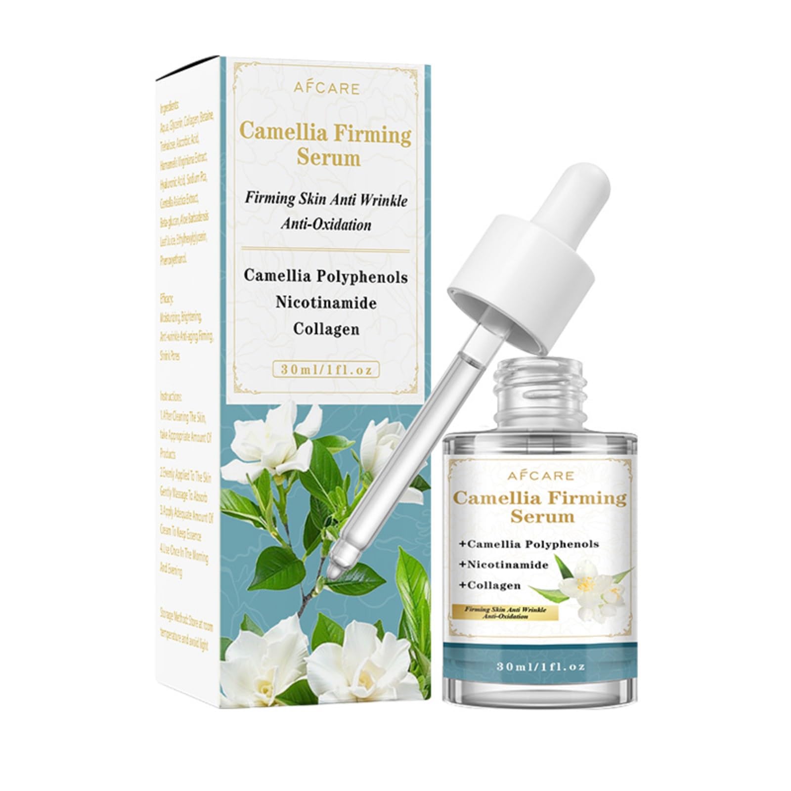 Experience the transformative power of nature with our Camellia Hydrating Serum. Crafted for those seeking radiant, youthful skin, this serum combines Camellia Japonica extract—a revered Asian botanical rich in antioxidants, they combat signs of aging by boosting collagen synthesis, reducing fine lines, and enhancing skin elasticity. Key Benefits: Deep Hydration: Hyaluronic Acid attracts and locks in moisture, combating dryness and creating a dewy, supple complexion. Gentle Anti-Aging: smooths wrinkles without the redness or peeling associated with traditional retinol, making it ideal for sensitive skin. Brightening Even Tone: Camellia's natural polyphenols neutralize free radicals, diminishing dark spots and environmental damage. Why Choose Us? Our serum is formulated in small batches to ensure freshness and potency. The vegan formula aligns with ethical beauty standards, while the airless pump packaging preserves ingredient integrity. Whether you're targeting early signs of aging or seeking intense hydration, this versatile serum adapts to your skincare routine. Apply 2-3 drops to cleansed skin morning and night, followed by your favorite moisturizer. Ingredient Transparency: Camellia Japonica Seed Extract: Sourced from sustainably harvested plants, known for its omega-rich properties. Hyaluronic Acid: Low-molecular-weight for deeper penetration.Visible Results in 4 Weeks: Regular use reveals firmer, smoother skin with reduced visible pores and improved tone. Perfect for daily use AM PM—pair with sunscreen for daytime protection. Vegan Ethical Commitment: Certified cruelty-free and formulated with 100 vegan ingredients. Our sustainable production aligns with eco-conscious practices, ensuring minimal environmental impact. Lightweight Fast-Absorbing: The silky, non-greasy texture penetrates quickly, leaving skin plump and refreshed. Ideal for layering under makeup or nighttime routines, suitable for all skin types, including sensitive and acne-prone complexions. Multi-Action Anti-Aging Benefits: Targets wrinkles, uneven texture, and dullness with a blend of antioxidants and Hyaluronic Acid. promotes collagen production without irritation, while Camellia oil restores the skin's moisture barrier for a radiant glow. Naturally Derived Formula: Infused with Camellia Japonica extract, this serum harnesses the power of botanicals to deeply hydrate, smooth fine lines, and improve skin elasticity. Free from synthetic fragrances, parabens, and sulfates for gentle yet effective care.