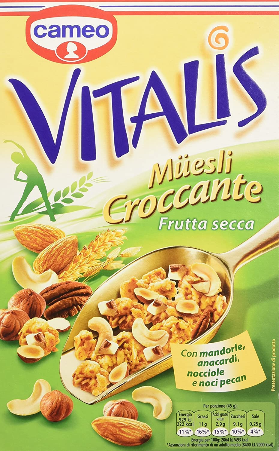 Ingredients: whole oat flakes 47 sunflower oil, sugar, glucose syrup, almonds in pieces 5.0 cashews, 5 dried wheat germs, rice flour, roasted walnuts in pieces 2.5 pecans in pieces of 2, 2. 0 treasure Whole sweet wheat flour, grape sugar, salt, dehydrated barley extract, skimmed milk, flavor (contains barley), contains soya, contains: almonds Contains: barley, cashew nuts. Contents: milk: oats, pecans. Contains: milk, pecans. Content: wheat wheat. Contains: almonds - Contains: Contains: cashews. Contains: hazelnuts. Contains: milk Contains: oats. Contains: pecans. Contains: soy. Contains: wheat wheat. May contain soy. INGREDIENTS INGREDIENTS Whole oatmeal 47 Sunflower oil Sugar Glucose syrup Almonds in pieces 5.0 Cashew nuts (cashew nuts) in pieces 5.0 Dried wheat germ Wheat flour Rice flour Toasted hazelnuts in pieces 2.5 Pecans in pieces 2.5 .0 shake. Soft wheat flour Glucose Salt Dehydrated barley malt extract Skimmed milk powder Flavor (contains barley) May contain soy ALLERGENS Contains: almonds: barley Contains: cashew nuts Contains: hazelnuts Contains: Milk Contains: Oats: pecans Contains: soya Contains: Wheat wheat Contains: Almonds Age: Barley Contains: cashews Contains: hazelnuts Contains: Milk Contains: Oats Contains: pecans Contains: soy Contains: wheat wheat May contain soyOne pack contains approximately six servings. 300 gram pack. Start your day strong with Vitalis Crispy Dried Fruit. With almonds, cashews, hazelnuts, and pecans. Ingrédients : flocons d'avoine entiers 47 huile de tournesol, sucre, sirop de glucose, amandes en morceaux 5,0 noix de cajou, 5 de germes de blé séchés, farine de riz, noix torréfiées en morceaux de 2,5 de noix de pécan en morceaux de 2, 2. 0 trésor Farine complète de blé doux, sucre de raisin, sel, extrait d'orge déshydraté, lait écrémé, arôme (contient de l'orge), contient du soja, contient : amandes Contient : orge, noix de cajou. Contenu : lait : avoine, noix de pécan. Contient : lait, noix de pécan. Contenu : blé blé. Contient : amandes - Contient : Contient : noix de cajou. Contient : noisettes. Contient : lait Contient : avoine. Contient : noix de pécan. Contient : soja. Contient : blé blé. Peut contenir du soja. INGRÉDIENTS INGRÉDIENTS Gruau entière 47 Huile de tournesol Sucre Sirop de glucose Amandes en morceaux 5,0 noix de cajou (noix de cajou) en morceaux 5,0 Germe de blé séché Farine de blé Farine de riz Noisettes grillées en morceaux 2,5 noix de pécan en morceaux 2,5 ,0 shake. Farine de blé tendre Glucose Sel Extrait de malt d'orge déshydraté Lait écrémé en poudre Arôme (contient de l'orge) Peut contenir du soja ALLERGÈNES Contient : amandes : orge Contient : noix de cajou Contient : noisettes Contient : Lait Contient : Avoine : noix de pécan Contient : soja Contient: Blé blé Contient : Amandes Âge: Orge Contient : noix de cajou Contient : noisettes Contient : Lait Contient : Avoine Contient : noix de pécan Contient : soja Contient : blé blé Peut contenir du sojaUn paquet contient environ six portions. Paquet de 300 grammes. Commencez renforcé dans la journée avec Vitalis croustillant aux fruits secs. Aux amandes, noix de cajou, noisettes et noix de pécan.