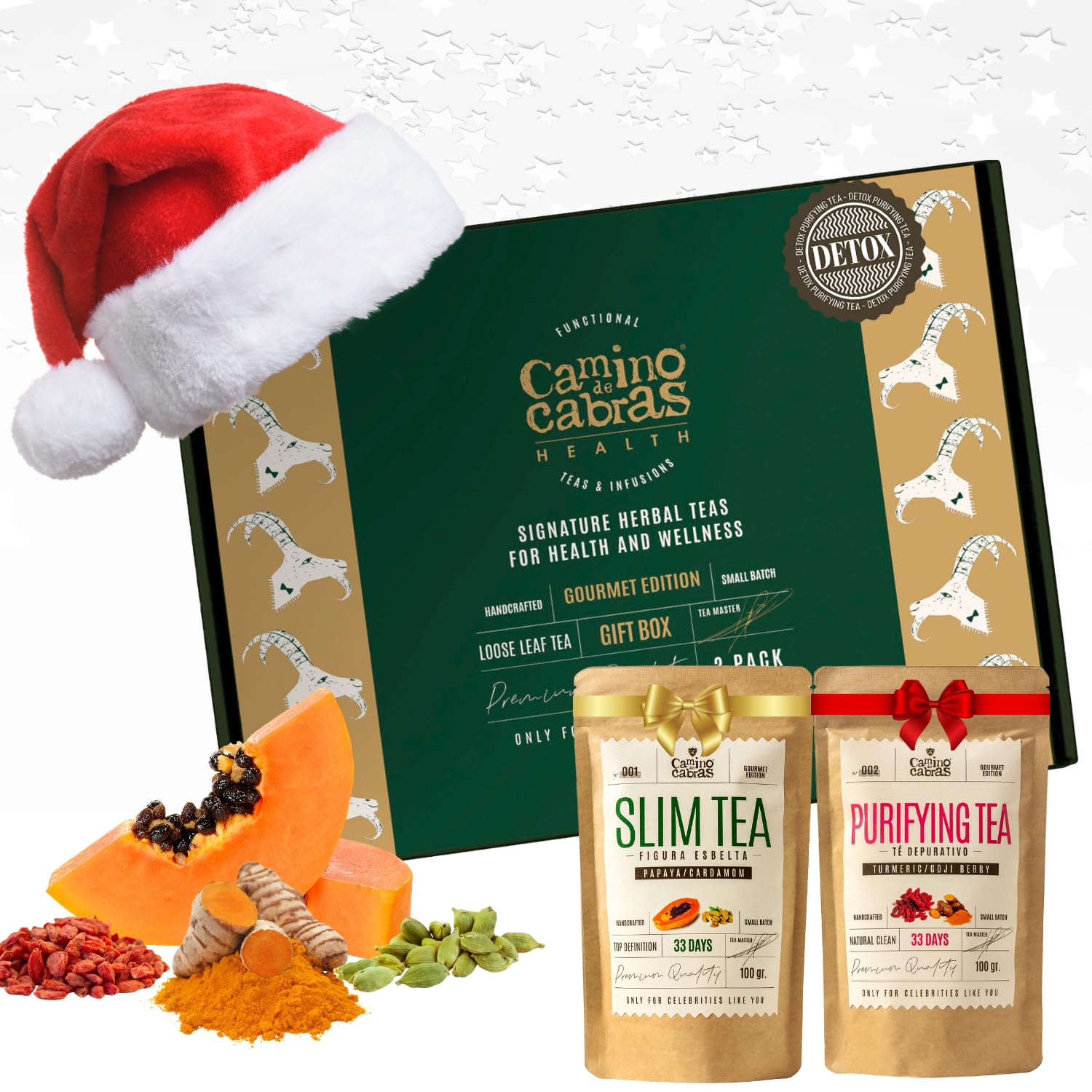 CAMINO DE CABRAS SLIM TEA & DETOX TEA Gift Set - Liver Detox Herbal Tea Draining - Green Tea Turmeric Ginger Dandelion Mate Goji Berry Papaya Cardamom - Natural Ingredients - Loose Leaf Tea 2 x 100g