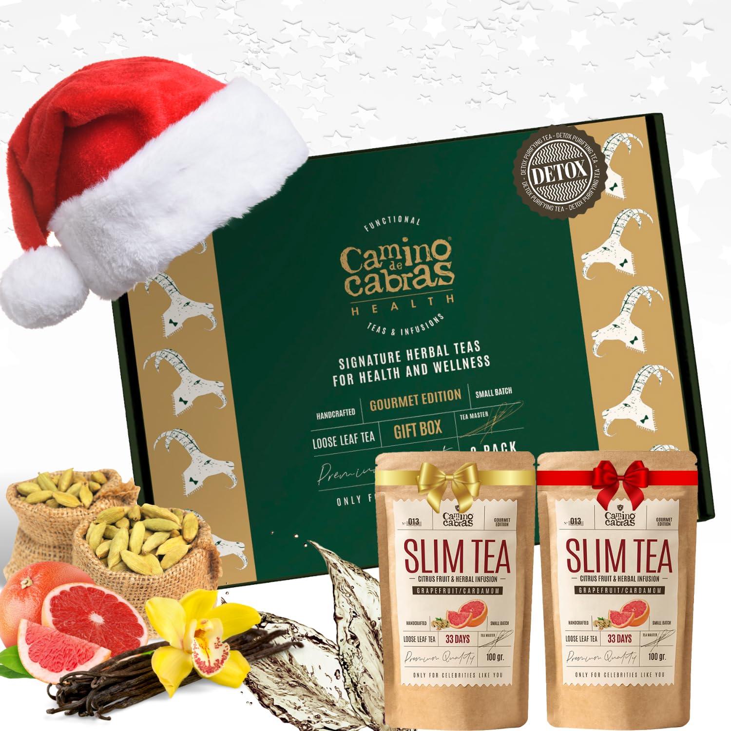 CAMINO DE CABRAS Slim Tea Grapefruit Gift Set Detox Cure Drainer Flat Stomach Digestion Energy Infusion Green Tea Dandelion Guarana Matcha Ginger Nettle Cardamom Bulk Herbal Tea Pack 2 x 100g