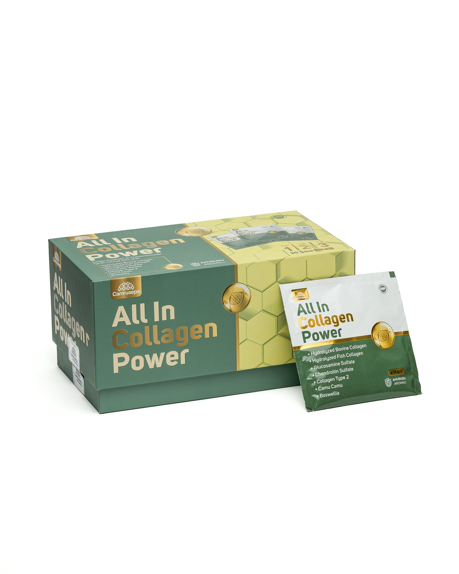Experience the transformative power of CAMRUSEPA All In Collagen Power, featuring a unique 10,000 mg collagen matrix that blends hydrolyzed bovine (Types 1 3) and marine (Type 2) peptides for comprehensive support. This advanced formulation works in synergy with Glucosamine, Hyaluronic Acid, and natural antioxidant extracts to help replenish collagen stores, promote connective tissue resilience, and support healthy cartilage. The raspberry-flavored powder not only tastes great but also dissolves quickly for effortless daily use. Incorporate this powerful collagen supplement into your routine to enhance skin hydration, maintain joint comfort, and support overall vitality from within. Recommended Use: Mix 1 sachet (14g) with 200–250 ml of water and consume once daily. Serves 30 days per container.