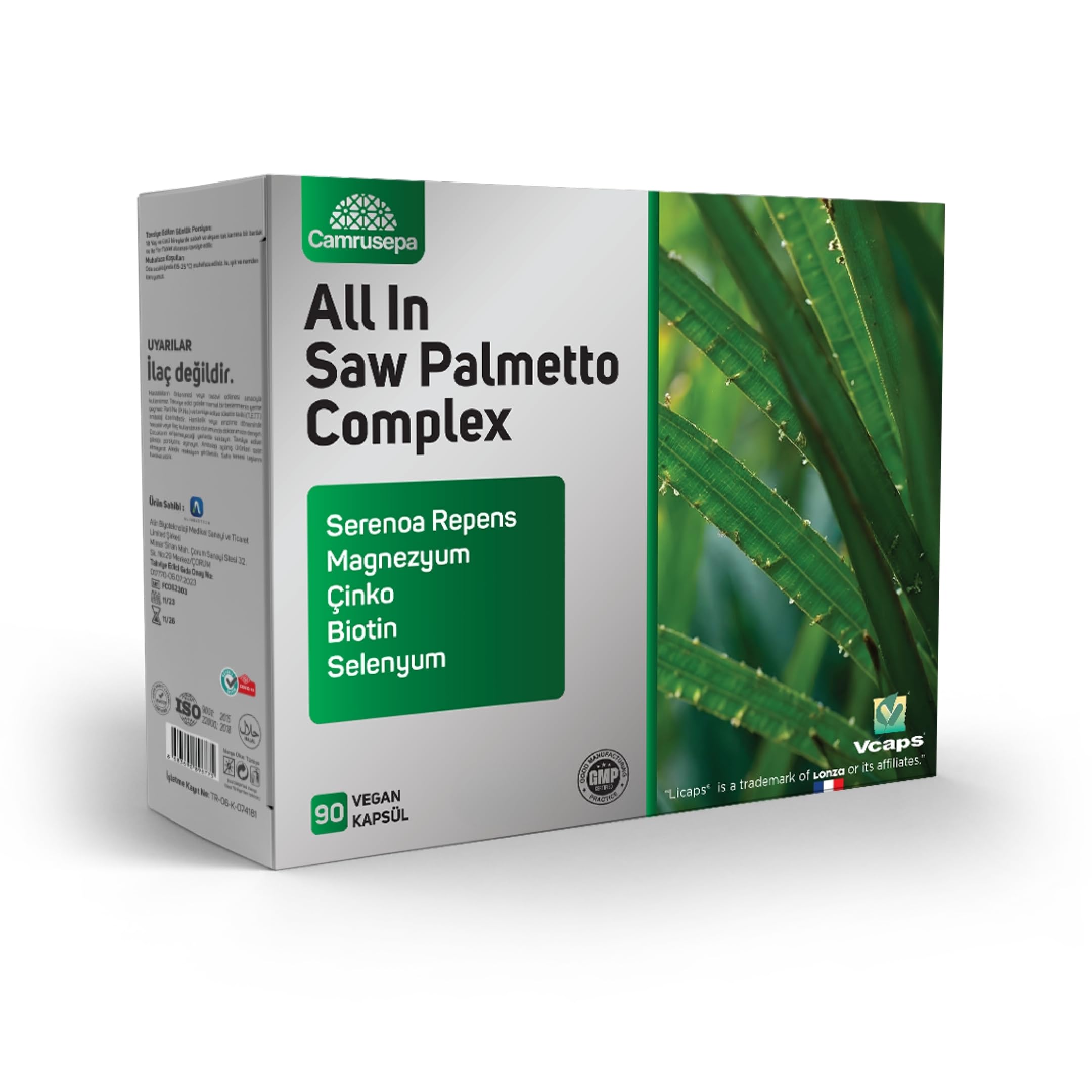 Camrusepa All in Saw Palmetto Complex Vegan Capsules with Serenoa repens Magnesium Zinc Biotin & Selenium Supports Prostate Hair Hormonal & Urinary Health 90 Caps