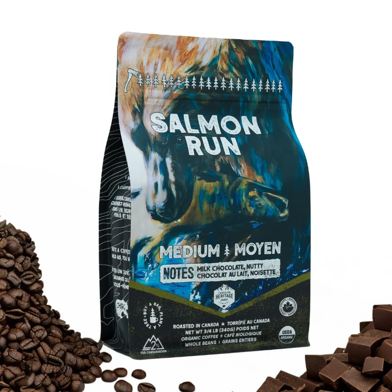 CANADA MADE, CANADA BOLD - We are the first Canadian coffee company to become 2% For Conservation certified. 1% of money + 1% of time to fish and wildlife habitat. 1 MILLION PLANTED - As a small Canadian business we understand the profound effect many small steps towards a larger goal can make – so for now, we walk towards planting 1 Million Trees on home soil by 2030. COFFEE AS WILD AS YOU ARE - We meticulously marry fresh and bold coffee with the urge to explore. Our camp-style methods were forged during the years we worked battling forest fires, and have evolved through backyard BBQ's, weekend mountain adventures, and late nights under star filled skies. PERFECT FOR - French Press, Drip, or Pour Over, Aeropress. Best Before date is set 1-Year from Roasting Date. All tasting notes are naturally occurring and subtle flavours that we bring out in the roasting process. There are no additives or artificial flavourings in our coffee. SALMON RUN - The perfect coffee if you are looking for that perfect brew for sitting on the bank of a river, taking in the crisp morning air on your porch, or for a smooth afternoon pick me up. Our Salmon Run has tasting is our smoothest offering with tasting notes of Milk Chocolate, a perfect breakfast coffee.
