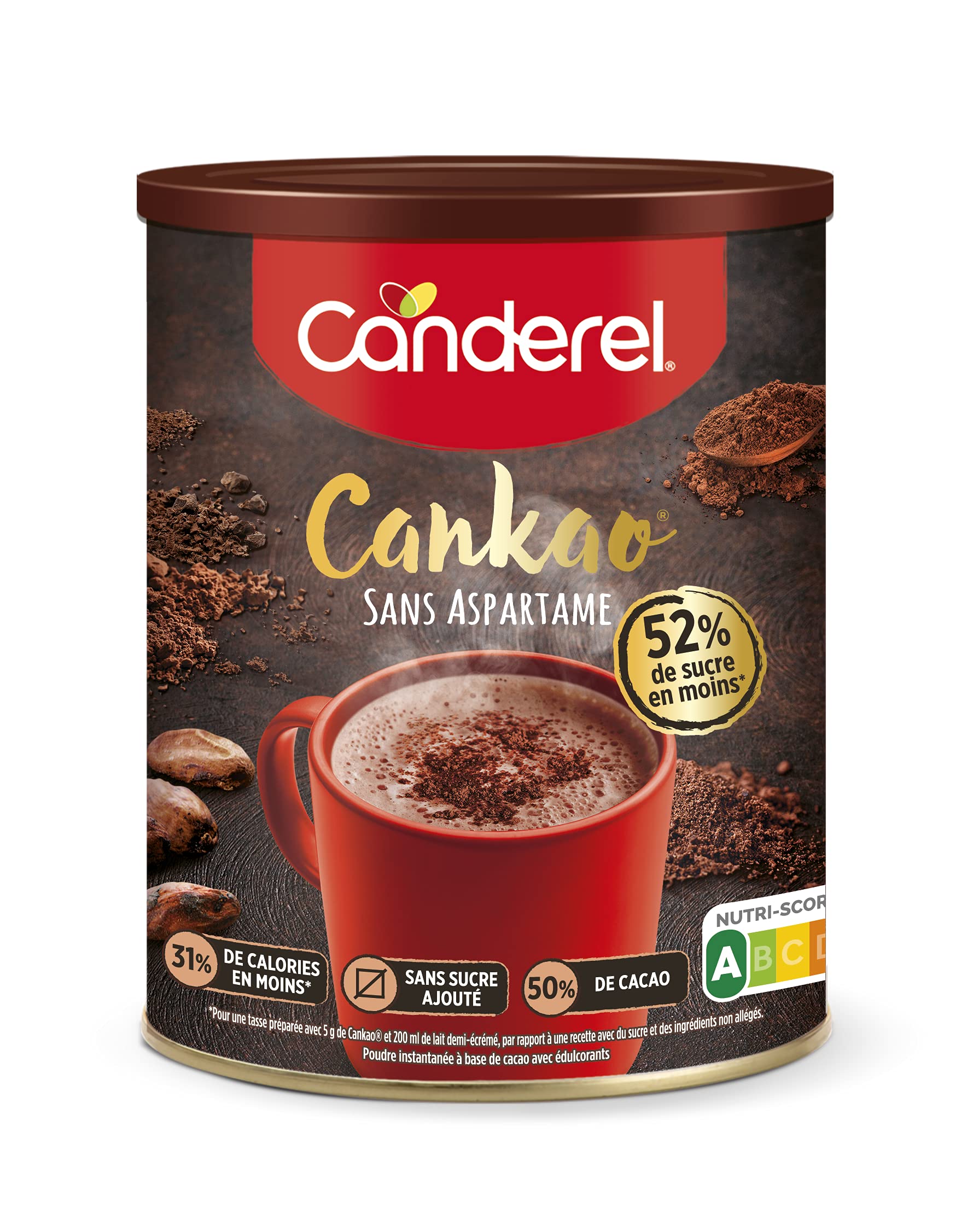 Founded in 1979, Canderel is a French brand now owned by the Merisant group. It specializes in tabletop sweeteners, calorie-free sugar substitutes. The brand has continuously reinvented itself and focused on innovation to offer its consumers safe ingredients with flavors virtually identical to sugar. Today, the majority of Canderel products no longer contain aspartame but sucralose, a sweetener derived from sugar but without calories. Some products also contain stevia, made from the plant of the same name. The Canderel range is now very extensive, and you can use it to replace sugar at any time of day. In addition to the popular sugar cubes for sweetening hot drinks, you will find various formats such as sticks, cubes, powder, liquid sugar, or vanilla sugar, which are perfect for cooking. You'll also discover Cankao, a low-calorie cocoa powder, for lighter, sweeter breaks with just as much flavor. Ideal for diets and for maintaining your daily health, Canderel products will help you indulge with complete peace of mind. The sucralose sweeteners will surprise you with their almost identical taste to sugar. Sucralose is a sweetener that leaves no bitter aftertaste and provides the same pleasure as sugar. Health authorities have approved its consumption, with no contraindications. You can now sweeten your drinks without guilt, as they contain no calories or aspartame. Cankao is one of the lowest-calorie cocoa powders on the market. Thanks to its high cocoa content and the presence of fiber, rediscover all the pleasure of chocolate with 38 fewer calories compared to a classic chocolate powder. So, stop feeling guilty and indulge in life's pleasures with Canderel. INGREDIENTS Cocoa powder 53.75 (fat-reduced cocoa powder 51 ), cocoa butter 10-12 , emulsifier: soy lecithin (non-GMO), bulking agent: polydextrose, wheat fiber (gluten-free ingredient), sweetener: aspartame, vanilla flavoring INSTRUCTIONS Please mix Cankao powder with water or other liquids according to your taste and preference. SAFETY WARNING May contain allergens. Not suitable for young children. Use as directed to avoid overconsumption. See moreCANDEREL - Cankao – Poudre de Cacao – 38 de Calories en moins - le Gout du Chocolat Sans Calorie – Boîte 250 g - Lot de 5DESCRIPTION DU PRODUIT DESCRIPTION DU PRODUIT Créée en 1979, Canderel est une marque française appartenant aujourd'hui au groupe Merisant. Elle est spécialisée dans les édulcorants de table, substitus au sucre sans calorie. La marque n'a cessé de se renouveler et de s'axer sur l'innovation pour offrir à ses consommateurs des ingrédients sûrs, aux saveurs quasiment identiques au sucre. Aujourd'hui, la majorité des produits Canderel ne contient plus d'aspartame mais du sucralose, un édulcorant provenant du sucre mais sans calorie. Des références existent aussi avec de la stevia, à base de la plante du même nom. La gamme Canderel est aujourd'hui très large et vous pourrez l'utiliser pour remplacer le sucre à tout moment de la journée. Outre les célèbres sucrettes pour sucrer les boissons chaudes, vous trouverez différents formats tels que les sticks, les morceaux, la poudre, le sucre liquide ou vanillé qui sont parfaits pour la cuisine. Vous découvrirez également Cankao, du cacao en poudre à faible teneur en calories, pour des pauses sucrées allégées et toujours autant d'arômes. Idéals pour les régimes et pour préserver sa santé au quotidien, les produits Canderel vous aideront à vous faire plaisir en toute sérénité. Les sucrettes sucralose vous surprendront par leur saveur quasiment identique au sucre. Le sucralose est un édulcorant qui ne présente pas d'arrière-goût amer et qui apporte un plaisir identique à celui du sucre. Les autorités de santé ont approuvé sa consommation, sans contre-indication. Vous pourrez désormais sucrer vos boissons sans complexe, car elles ne contiennent aucune calorie, ni aspartame. Cankao est l'une des poudres de cacao à plus faible teneur en calories du marché. Grâce à sa forte teneur en cacao et à la présence de fibres, retrouvez tout le plaisir du chocolat avec 38 de calories en moins par rapport à une poudre chocolatée classique. Alors, ne culpabilisez plus et ne résistez plus aux plaisirs de la vie, avec Canderel. INGRÉDIENTS Poudre à base de cacao 53,75 (cacao maigre en poudre 51 ), beurre de cacao 10-12 , émulsifiant: lécithine de soja (sans OGM), agent de charge : polydextrose, fibres de blé (ingrédient ne contenant pas de gluten), édulcorant: aspartame, arôme de vanille MODE D'EMPLOI Veuillez mélanger la poudre Cankao avec de l'eau ou d'autres liquides selon votre goût et préférence. AVERTISSEMENT DE SÉCURITÉ Peut contenir des allergènes. Ne convient pas aux jeunes enfants. Utiliser comme indiqué pour éviter la surconsommation. Voir plus
