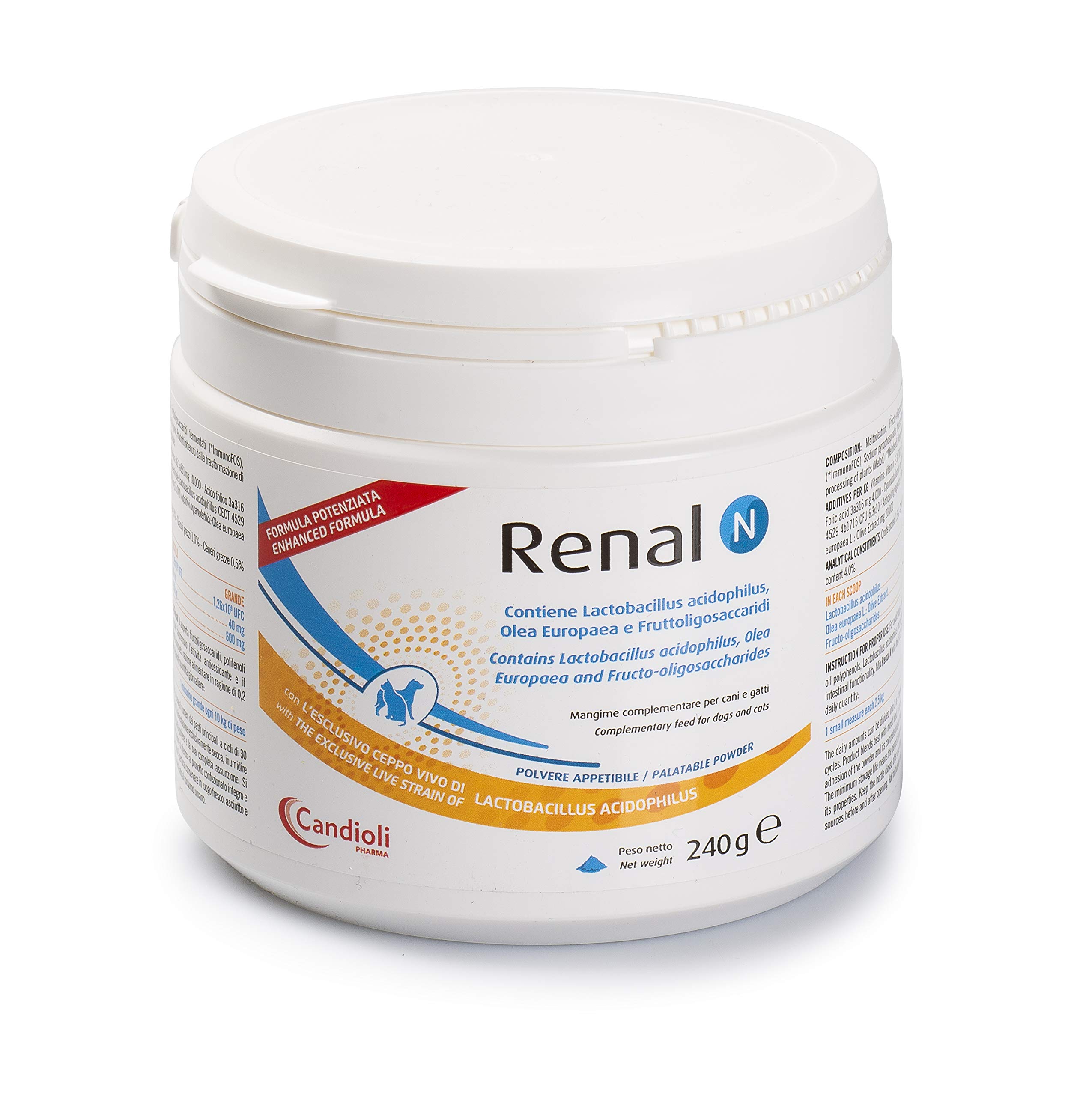 Renal n provides fruit toligosaccharides, polyphenols from olive oil, lactobacillus acidophilus and vitamins that promote antioxidant activity and the maintenance of normal metabolism.Made in: Italy. Complementary food for dogs and cats. Easy to administer, measuring cup included. Contains lactobacillus acidophilus, European oil, and fructoligosaccharides. Renal n apporte des fruits toligosaccharides, des polyphénols de l'huile d'olive, du lactobacillus acidophilus et des vitamines qui favorisent l'activité antioxydante et le maintien du métabolisme normal.Fabriqué en : Italie. Aliments complémentaires pour chiens et chats. Facile à administrer, doseur inclus. Contient du lactobacillus acidophilus, de l'huile européenne et des fructoligosaccharides.