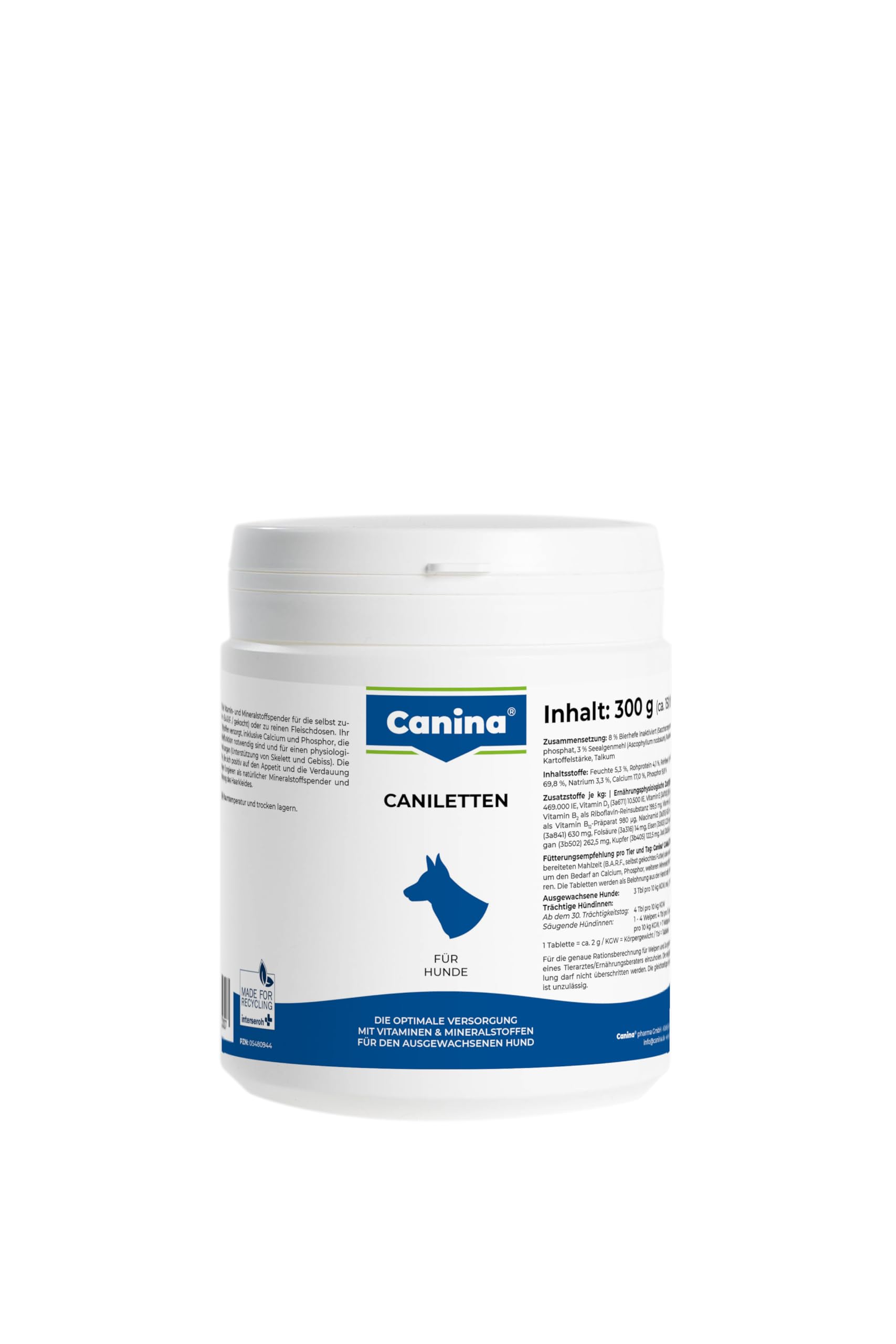 Mineral food supplement for dogs. Canilettes: the biological strength concentrate is part of every food, even that you eat. Feed the canilettes daily and your dog is supplied with: minerals, trace elements, calcium and phosphorus (important for the skeleton, bone building, bites, muscles), yeast (for metabolism, appetite, digestion), seaweed meal (for pigmentation) and essential vitamins. For puppies and young dogs we recommend Canina lime. - Closes completely after a few hours, while most traditional lime preparations only open after several days. - Also available in powder. Content: 300g. Composition ingredients additives: Composition : Calcium carbonate, calcium magnesium phosphate, monocalcium phosphate, yeast 7 , strain flour 3 , sodium chloride. Ingredient content: Calcium 17.0 , phosphorus 9.8 , sodium 3.3 . Nutritional additives per kg: Vitamin A 470,000 IU, vitamin D3 10,000 IU, vitamin E 280 mg, vitamin B1 85 mg, vitamin B2 200 mg, vitamin B6 85 mg, vitamin B12 980 mcg, nicotinic acid 630 mg, pantothenic acid 630 mg, folic acid 14 mg. g, iron 1.2. 25 mg (iron (II) sulfate, monohydrate), copper 120 mg (copper (II) sulfate, pentahydrate), manganese 260 mg (as manganese (II) oxide), zinc 525 mg (as zinc oxide), iodine 4 mg (as calcium iodate anhydrous), selenium 6 mg (as sodium selenium). it), cobalt. 1.5 mg. Feeding recommendation per animal per day: Information in tablets up to 10 kg to 20 kg and over 20 kg dry food 1, 2, 5, wet food 2 4 7. Lining: 4, 7, 10. From the 30th day of gestation and for lactating female dogs, the dosage should be doubled according to the table (2 x conservation requirements). The stated feeding recommendation should not be exceeded. Simultaneous administration of vitamin D2 is not permitted. INGREDIENTS Limited ingredients, organicSimultaneous administration of vitamin D2 is not permitted. The indicated feeding recommendation should not be exceeded. Feeding recommendation per animal per day: Tablet indications: Dry food: up to 10 kg - 1 to 20 kg - 2 over 20 kg - 5 Wet food: up to 10 kg - 2 to 20 kg - 4 over 20 kg - 7 themselves. Lining: up to 10 kg - 4 to 20 kg - 7 over 20 kg - 10. Ingredients: Calcium 17.0 , Phosphorus 9.8 , Sodium 3.3 . Composition: Calcium carbonate, calcium magnesium phosphate, monocalcium phosphate, yeast 7 , soup flour 3 , sodium chloride. Closes completely after a few hours. Provides the dog with trace elements, minerals, calcium, phosphorus, yeast, seaweed flour and important vitamins. Concentrated biological strength. Versatile supplier. Complément alimentaire minéral pour chiens. Canilettes : le concentré de force biologique fait partie de chaque aliment, même que vous mangez. Nourrir quotidiennement les canilettes et votre chien est alimenté en : minéraux, oligo-éléments, calcium et phosphore (important pour le squelette, la construction osseuse, les morsures, les musclatures), la levure (pour le métabolisme, l'appétit, la digestion), la farine d'algues marines (pour la pigmentation) et les vitamines essentielles. Pour les chiots et les jeunes chiens, nous vous recommandons la chaux Canina. - Se ferme complètement au bout de quelques heures, tandis que la plupart des préparations de calcaire traditionnelles ne sont ouvertes qu'après plusieurs jours. - Également disponible en poudre. Contenu : 300 g. Composition ingrédients additifs : Composition : Carbonate de calcium, phosphate de magnésium de calcium, phosphate monocalcique, levure 7 , farine de souche 3 , chlorure de sodium. Teneur en ingrédients : Calcium 17,0 , phosphore 9,8 , sodium 3,3 . Additifs nutritionnels par kg : Vitamine A 470 000 UI, vitamine D3 10,000 UI, vitamine E 280 mg, vitamine B1 85 mg, vitamine B2 200 mg, vitamine B6 85 mg, vitamine B12 980 mcg, acide nicotinique 630 mg, acide pantothénique 630 mg, acide folique 14 mg. g, fer 1.2. 25 mg (sulfate de fer (II), monohydrate), cuivre 120 mg (sulfate de cuivre (II), pentahydrate), manganèse 260 mg (comme oxyde de manganèse (II), zinc 525 mg (comme oxyde de zinc), iode 4 mg (comme iodate de calcium anhydre), sélénium 6 mg (comme sélénium de sodium). it), cobalt. 1,5 mg. Recommandation d'alimentation par animal et par jour : Informations en comprimés jusqu'à 10 kg à 20 kg et plus de 20 kg de nourriture sèche 1, 2, 5, nourriture humide 2 4 7. Doublure : 4, 7, 10. À partir du 30e Jour de gestation et pour les chiennes allaitantes, le dosage doit être doublé en fonction du tableau (2 x besoins de conservation). La recommandation d'alimentation indiquée ne doit pas être dépassée. L'administration simultanée de vitamine D2 n'est pas autorisée. INGRÉDIENTS Ingrédients limités, biologiquesL'administration simultanée de vitamine D2 n'est pas autorisée. La recommandation d'alimentation indiquée ne doit pas être dépassée. Recommandation d'alimentation par animal et par jour : indications en comprimés : nourriture sèche : jusqu'à 10 kg - 1 à 20 kg - 2 de plus de 20 kg - 5 aliments humides : jusqu'à 10 kg - 2 à 20 kg - 4 de plus de 20 kg - 7 eux-mêmes. Doublure : jusqu'à 10 kg - 4 à 20 kg - 7 plus de 20 kg - 10. Ingrédients : calcium 17,0 , phosphore 9,8 , sodium 3,3 . Composition : carbonate de calcium, phosphate de magnésium de calcium, phosphate monocalcique, levure 7 , farine de soupe 3 , chlorure de sodium. Se ferme complètement après quelques heures. Fournit au chien des oligo-éléments, des minéraux, du calcium, du phosphore, de la levure, de la farine d'algues marines et des vitamines importantes. Concentré de force biologique. Fournisseur polyvalent.