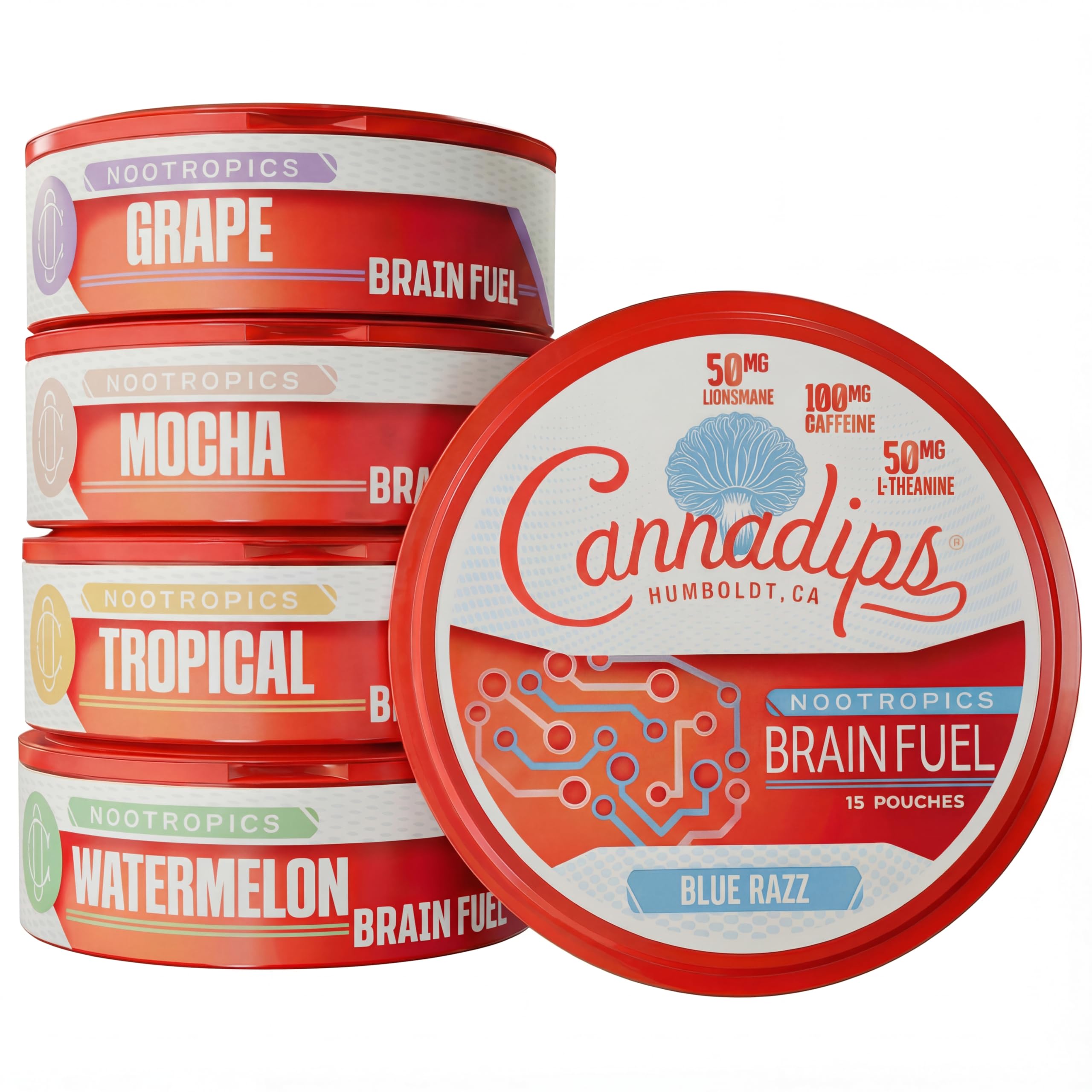 Cannadips - Brain Fuel Variety Pack - Nootropic Caffeine Pouches - 50mg Lion's Mane, 100mg Caffeine, 50mg L-Theanine, No Sugar - Clean Energy Brain Fuel for Cognitive Performance, Made in USA (5-PACK)