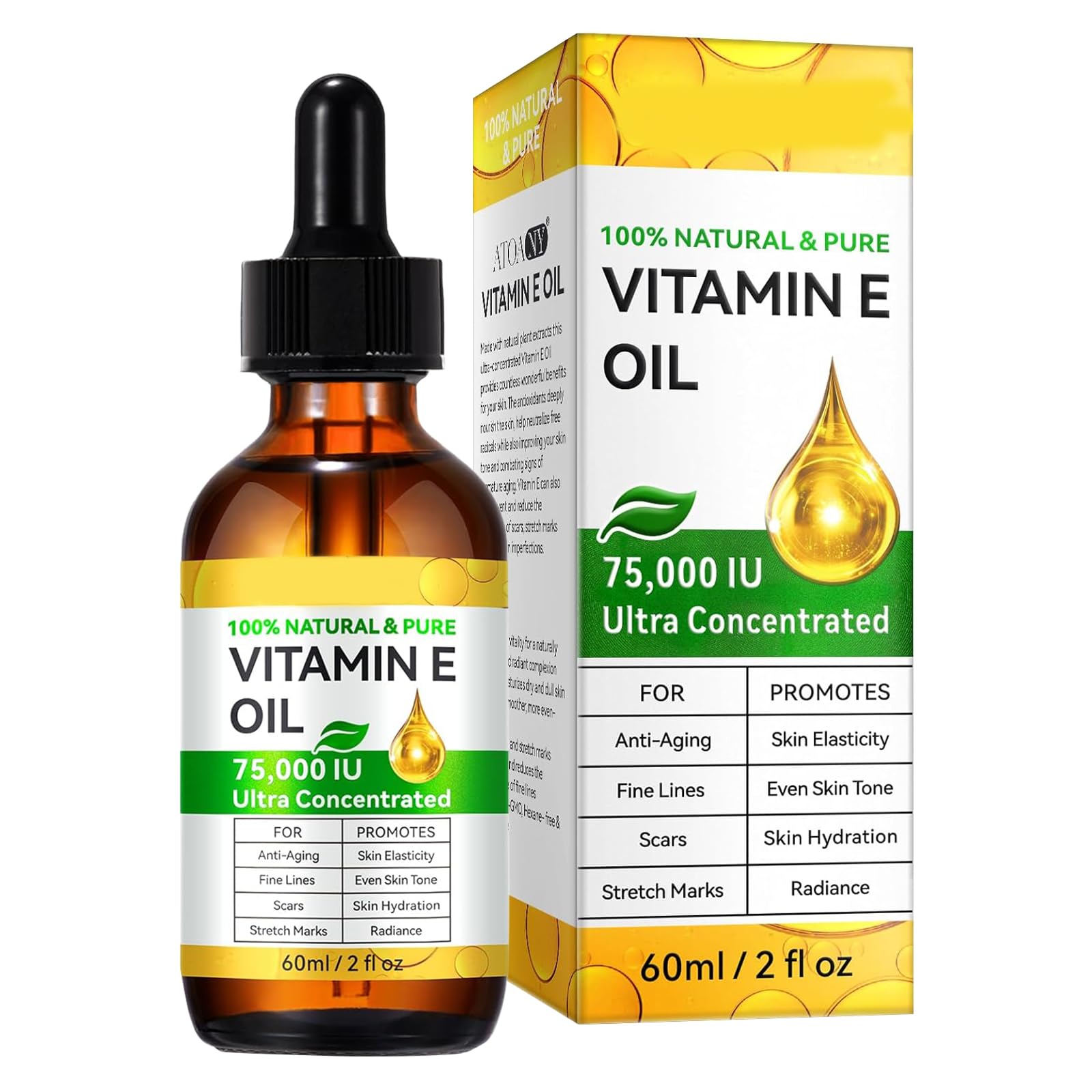 : Main features: Intensively hydrates and protects the skin from drying out. Easily absorbing vitamin E oil for face and body, without a greasy feeling. Pure organic vitamin E oil for cosmetics, ideal for sensitive skin. Versatile to use as a facial oil, skin care oil or massage oil. Product benefits: Promotes radiant, youthful skin and improves skin elasticity. Antioxidant properties protect the skin against free radicals and premature skin aging. Usage: 1st For the face: apply 2-3 drops to cleansed skin in the morning and evening. Massage gently into face and neck. 2nd For the body: massage into damp skin after showering to intensively hydrate the skin. 3rd For the hair: Apply to the ends of the hair to strengthen frizz and add shine. 4th For scars stretch marks: apply directly to the affected areas and massage until the oil is absorbed. The package contains: 1 x vitamin E oil 75,000 IU (60 ml). Warnings: Perform a patch test before use and adhere to the recommended application times to avoid irritation. If there is redness or allergic reactions, stop using immediately. SAFETY WARNING noneVersatile and easy to use: perfect for face, body and hair. Use it as a daily facial serum, body moisturizer, massage oil, cuticle oil or hair care oil. Mix it with your favorite lotions or creams for an extra boost of moisture. Improves scars and stretch marks: This high-dose vitamin E oil supports the natural regeneration of the skin and reduces the appearance of scars, stretch marks and wrinkles. Thanks to its antioxidant effect, it protects against free radicals and gives the complexion a youthful appearance. Deep effective moisture and anti-aging: say goodbye to dry, flaky skin. This light oil intensively hydrates and reduces the appearance of fine lines, wrinkles and dullness. Restores elasticity for a youthful, radiant complexion. Natural Ingredients: Our Vitamin E oil is pure, vegan and not tested on animals. Free from harsh chemicals, safe for daily use for all skin types. Promotes skin repair and improves overall texture for a more even skin tone. Intensive hydration and skin protection: our high-quality vitamin E oil with 75,000 IU is rich in antioxidants, which protect your skin against free radicals and environmental damage. It helps to repair and rejuvenate your skin and makes it soft, smooth and radiant.Vitamine E-olie voor cosmetica, 75.000 IE, pure vitamine E-olie voor huid, hydraterend en huidverstevigend, vermindert fijne lijntjes en littekens, gemakkelijk absorberende lichaamsolie gezichtsolie : Belangrijkste kenmerken: Hydrateert intensief en beschermt de huid tegen uitdrogen. Gemakkelijk absorberende vitamine E-olie voor gezicht en lichaam, zonder vettig gevoel. Zuivere biologische vitamine E-olie voor cosmetica, ideaal voor de gevoelige huid. Veelzijdig te gebruiken als gezichtsolie, huidverzorgingsolie of massageolie. Productvoordelen: Bevordert een stralende, jeugdige huid en verbetert de huidelasticiteit. Antioxiderende eigenschappen beschermen de huid tegen vrije radicalen en vroegtijdige huidveroudering. Gebruik: 1ste Voor het gezicht: 's ochtends en 's avonds 2-3 druppels op de gereinigde huid aanbrengen. Zacht in gezicht en hals inmasseren. 2de Voor het lichaam: na het douchen in de vochtige huid inmasseren om de huid intensief te hydrateren. 3de Voor het haar: Aanbrengen op de haarpunten om kroes te verstevigen en glans te geven. 4de Voor littekens striae: direct op de aangetaste gebieden aanbrengen en inmasseren tot de olie is geabsorbeerd. Het pakket bevat: 1 x vitamine E-olie 75.000 IE (60 ml). Waarschuwingen: Voor gebruik een patchttest uitvoeren en zich aan de aanbevolen inwerktijden houden om irritatie te voorkomen. Bij roodheid of allergische reacties onmiddellijk stoppen met het gebruik. VEILIGHEIDSWAARSCHUWING geenVeelzijdig en eenvoudig te gebruiken: perfect voor gezicht, lichaam en haar. Gebruik het als dagelijks gezichtsserum, vochtinbrengende crème voor het lichaam, massageolie, nagelriemolie of haarverzorgingsolie. Meng het met je favoriete lotions of crèmes voor een extra boost aan vocht. Verbetert littekens en striae: deze hooggedoseerde vitamine E-olie ondersteunt de natuurlijke regeneratie van de huid en vermindert het uiterlijk van littekens, striae en rimpels. Dankzij de antioxiderende werking beschermt het tegen vrije radicalen en geeft de teint een jeugdige uitstraling. Diepe effectieve vochtigheid en anti-aging: neem afscheid van een droge, schilferige huid. Deze lichte olie hydrateert intensief en vermindert het uiterlijk van fijne lijntjes, rimpels en saaiheid. Herstelt de elasticiteit voor een jeugdige, stralende teint. Natuurlijke ingrediënten: onze vitamine E-olie is zuiver, veganistisch en vrij van dierproeven. Vrij van agressieve chemicaliën, veilig voor dagelijks gebruik voor alle huidtypes. Bevordert de huidherstel en verbetert de algemene textuur voor een gelijkmatigere huidtint. Intensieve hydratatie en huidbescherming: onze hoogwaardige vitamine E-olie met 75.000 IU is rijk aan antioxidanten, die je huid beschermen tegen vrije radicalen en milieuschade. Het helpt om je huid te repareren en te verjongen en maakt hem zacht, glad en stralend.
