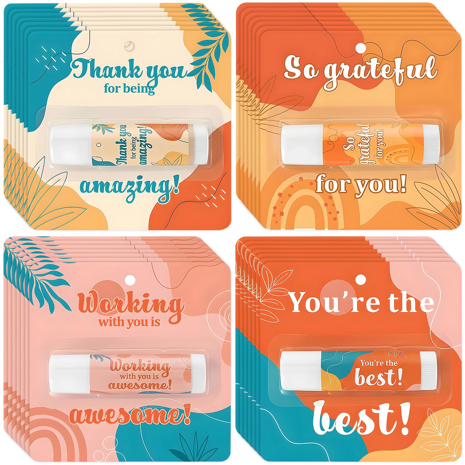 Features: Wide application: Inspired by a retro appreciation theme, this thank-you lip balm set features bright, vintage-style patterns and warm gratitude messages. The unique insert-card design instantly captures attention, making it perfect for employee gifting, team-building events, client appreciation, office celebrations, or everyday thank-you moments. Ideal appreciation gift for everyone: Share your warm wishes by sending these retro thank-you lip balms to coworkers, employees, volunteers, teachers, friends, and team members. Specifications: Quantity: 28 pieces Material: beeswax Color: multicolor Size: (about) Boho lip balms: 0.16 oz Package includes: 28 x Boho lip balms Notes: Manual measurement, please allow slight errors on size. Due to the screen display, the color of the item may differ slightly from the pictureEmployee Appreciation Gifts: our retro employee gift are ideal for employee thank-you gifts, office party favors, team appreciation gifts, volunteer gifts, teacher gifts, or client giveaways. Nice for staff recognition events, holiday gift bags, party favors, and bulk office gift in. Portable Lip Balm: each lip balm gift is approximately 0.16 oz and comes in a compact tube with a beautifully designed insert card. Small, lightweight, and portable, it easily fits into a purse, pocket, or desk drawer, allowing recipients to feel appreciated anytime, anywhere. Conveying Warm Wishes: each appreciation lip balm card is printed with uplifting and heartwarming messages, perfectly expressing gratitude to colleagues, employees, volunteers, teachers, and team members. The retro color palette and vibrant graphics enhance the charm of every gift. Safe Ingredients: our retro thank-you lip balms are made with safe, skin-friendly ingredients, with the full ingredient list clearly displayed on the back of each insert card. The moisturizing, non-sticky formula keeps lips soft and comfortable whether used in the office, outdoors, or during dry weather. Thank You Lip Balm Set: you will receive 28 individually packaged insert-card lip balms in four scents: lemon, strawberry, honey, and orange. These retro employee appreciation lip balms feature warm gratitude messages, making them an ideal gift for office events.