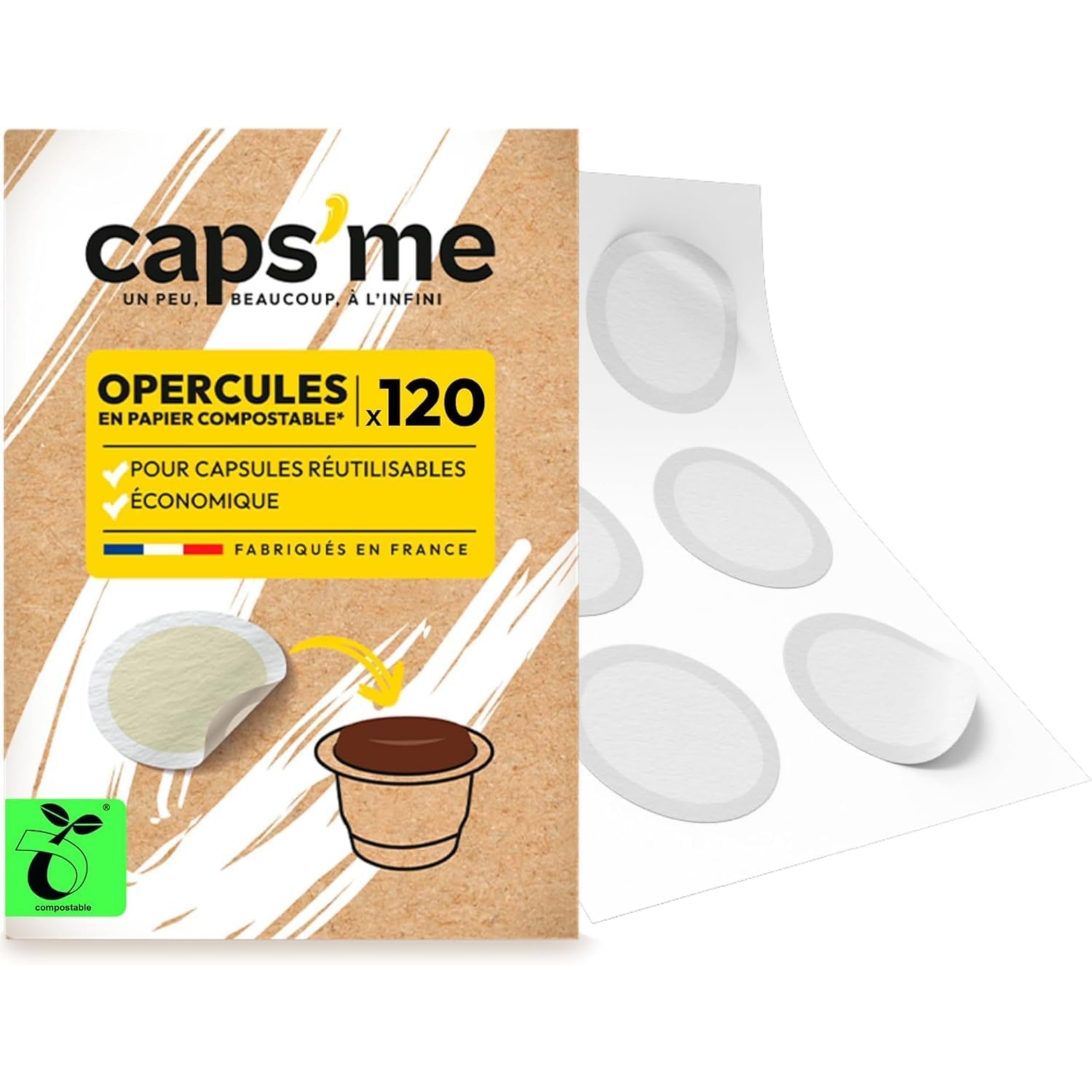 CAPSME - 120 Couvercles Opercules en Papier Compostable pour Capsules Réutilisables Compatible Nespresso Original - Filtre à Extraction Optimale Écologique made in France facile à coller.
