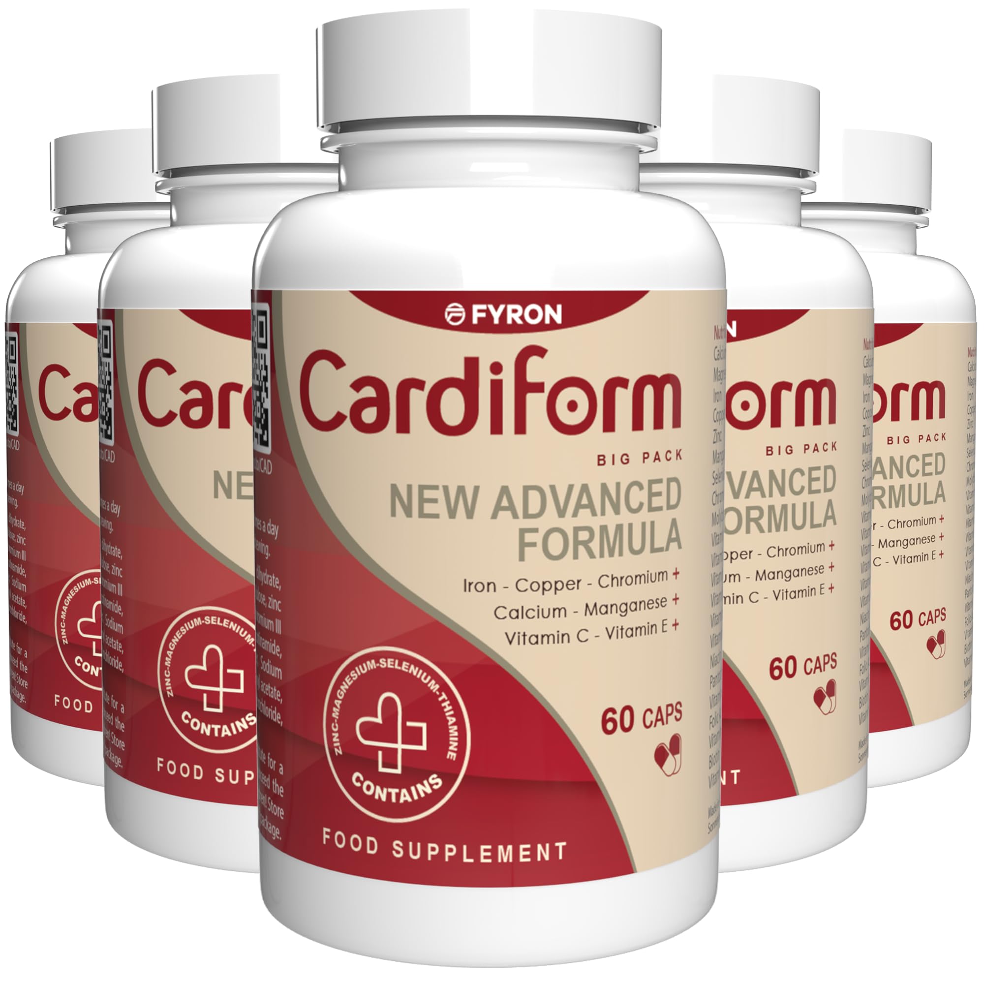 Cardiform - 300 capsules (5 x 60 capsules), pack of 5 INGREDIENTS Calcium carbonate, calcium ascorbate dihydrate, magnesium oxide, capsule shell: hydroxypropylmethylcellulose, zinc gluconate, ferrous bisglycinate, D-alpha tocopherol acetate, chromium(III) chloride 6-hydrate, manganese gluconate dihydrate, nicotinamide, calcium pantothenate, vitamin K2 - MK7 pulsa. ver, sodium molysate. BDAT, sodium selenite, cholecalciferol powder, retinyl acetate, copper bisglycinate, thiamine mononitrate, pyridoxine hydrochloride, riboflavin, folic acid, D-biotin, methylcobalamin DIRECTIONS Take 1 capsule twice a day (morning and evening) with plenty of water and swallow whole. SAFETY WARNING Food supplements are not a substitute for a balanced and varied diet and a healthy lifestyle. The recommended daily intake should not be exceeded. Keep out of reach of children. See more? Our promise - 100 satisfaction or your money back. We are known for our excellent customer service and thousands of satisfied customers. In case of any defect or dissatisfaction, we guarantee an immediate replacement or a full refund, no questions asked. B-VITAMINS - Vitamin B1 (thiamine) contributes to normal heart function. Vitamin B2 (riboflavin) contributes to the maintenance of normal red blood cells. Vitamin B6 (pyridoxine) contributes to normal homocysteine metabolism. Vitamin B9 (folic acid) contributes to normal blood formation. [ Regulation (EC) No 1924 2006 on health information from the EU]. Vitamins and minerals: Vitamin C contributes to normal collagen formation for the normal function of blood vessels. Vitamin K and calcium contribute to normal blood clotting. Vitamin A plays a role in cell specialization. Iron contributes to the normal formation of red blood cells and hemoglobin. Also contains vitamins B3, B5, B7, C, E, zinc, selenium, magnesium, copper, manganese, chromium, and molybdenum. Immune system: The immune system is the collection of organs, tissues, cells, and molecules that ensure our body's immunity. The immune system protects the body against internal malfunctions and external attacks. The body is a complex collection of 3 billion cells and 10 billion bacteria that must work together. Original Swiss recipe: The best guarantee of purchg the authentic, optimal formula composed of 22 vitamins and minerals. Contents: 60 high-nutrient capsules Highly dosed, 100 plant-based vegan: no fillers, no colors or additives For men and women Easy to take Maximum safety and purityCardiform - 300 gélules (5 x 60 capsules), lot de 5DESCRIPTION DU PRODUIT DESCRIPTION DU PRODUIT Cardiform - 300 gélules (5 x 60 capsules), lot de 5 INGRÉDIENTS carbonate de calcium, ascorbate de calcium dihydraté, oxyde de magnésium, enveloppe de la gélule : hydroxypropylméthylcellulose, gluconate de zinc, bisglycinate de fer, acétate de D-alpha tocophérol, chlorure de chrome III chlorure 6-hydraté, gluconate de manganèse dihydraté, nicotinamide, pantothénate de calcium D-calcium, vitamine K2 - MK7 pulsa. ver, molyse de sodium. bdat, sélénite de sodium, poudre de cholécalciférol, acétate de rétinyle, bisglycinate de cuivre, mononitrate de thiamine, chlorhydrate de pyridoxine, riboflavine, acide folique, D-biotine, méthylcobalamine MODE D'EMPLOI A prendre 2 fois par jour (matin et soir), 1 gélule à manger avec beaucoup d'eau et sans mâcher. AVERTISSEMENT DE SÉCURITÉ Les compléments alimentaires ne remplacent pas une alimentation équilibrée et variée et un mode de vie sain. La dose journalière recommandée ne doit pas être dépassée. Tenir hors de portée des enfants Voir plus? Notre promesse - Satisfaction à 100 ou remboursement. Nous sommes connus pour notre excellent service client et des milliers de clients satisfaits. En cas de défaut ou de mécontentement de toute nature, nous garantissons un remplacement immédiat ou un remboursement sans conditions. B-VITAMINE - La vitamine B1 (thiamine) contribue à une fonction cardiaque normale La vitamine B2 (riboflavine) contribue au maintien des globules rouges normaux dans La vitamine B6 (pyridoxine) contribue à un métabolisme normal de l'homocystéine dans la vitamine B9 (acide folique) contribue à une formation sanguine normale obalamine) porte à une formation normale de globules rouges [ règlement (CE) n 1924 2006 Informations relatives à la santé de l'UE]. Vitamines et minéraux : la vitamine C contribue à une formation normale de collagène pour un fonctionnement normal des vaisseaux sanguins - La vitamine K et le calcium contribuent à une coagulation sanguine normale - La vitamine A a une fonction dans la spécialisation cellulaire - Le fer contribue à la formation normale de globules rouges et d'hémoglobine. Composé également de vitamine B3, vitamine B5, Vitamine B7, vitamine C, vitamine E, zinc, sélénium, magnésium, cuivre, manganèse, chrome et molybdène. Système immunitaire - Le système immunitaire est l'ensemble des organes, tissus, cellules et molécules qui assurent l'immunité de notre organisme. Le système immunitaire protège le corps contre les dysfonctionnements internes et les attaques externes. Le corps est une collection complexe de 3 milliards de cellules et 10 milliards de bactéries qui doivent travailler ensemble. Recette originale de Suisse - Meilleure garantie d'acheter la formule optimale authentique composée de 22 vitamines et minéraux. Contenu: 60 gélules à haute teneur en nutriments Hautement dosé, 100 végétal végétalien : sans charges, sans colorants ni additifs Pour hommes et femmes Facile à prendre Sécurité et pureté maximales .