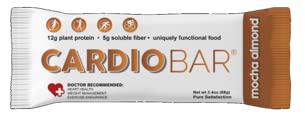 Mocha Almond CardioBar's main ingredient is Organic Almond Butter rather than other nut butters such as peanut butter, giving CardioBar a premium nutrient value. Rich organic mocha flavor in each bite. CARDIOBAR BENEFITS - CardioBar is for ALL athletes engaged in any type of endurance activities. The EXTREME Athlete, Sports – Performance markets, are turning to CardioBar, for the delicious taste and cutting edge, food science nutritional benefits. A medical food research study conducted at The University of KY Medical School, showed to lower cholesterol as effectively as prescription drugs, in the majority of participants. SUPREME TASTE - CardioBar accomplishes its goals of being healthy and delicious, by using the very best ingredients in a formula designed to be a carrier of nutritionally active plant based medical food components. Enjoy out of the wrapper or bake at home. CardioBar is a self-care nutrition product with a wealth of supplemental ingredients for your health benefits. FUNCTIONAL FOOD - CardioBar delivers added value, by using only the finest ingredients. CardioBar is the perfect platform for delivering hi-tech, organic, plant based nutrition. Eat our nutrition bar before or after your game, tennis match, during your round of golf, while hiking, biking, on the go in your car, at work, put in your child's lunch box. CardioBar is the perfect low cholesterol snack for whenever "clean energy" is needed.