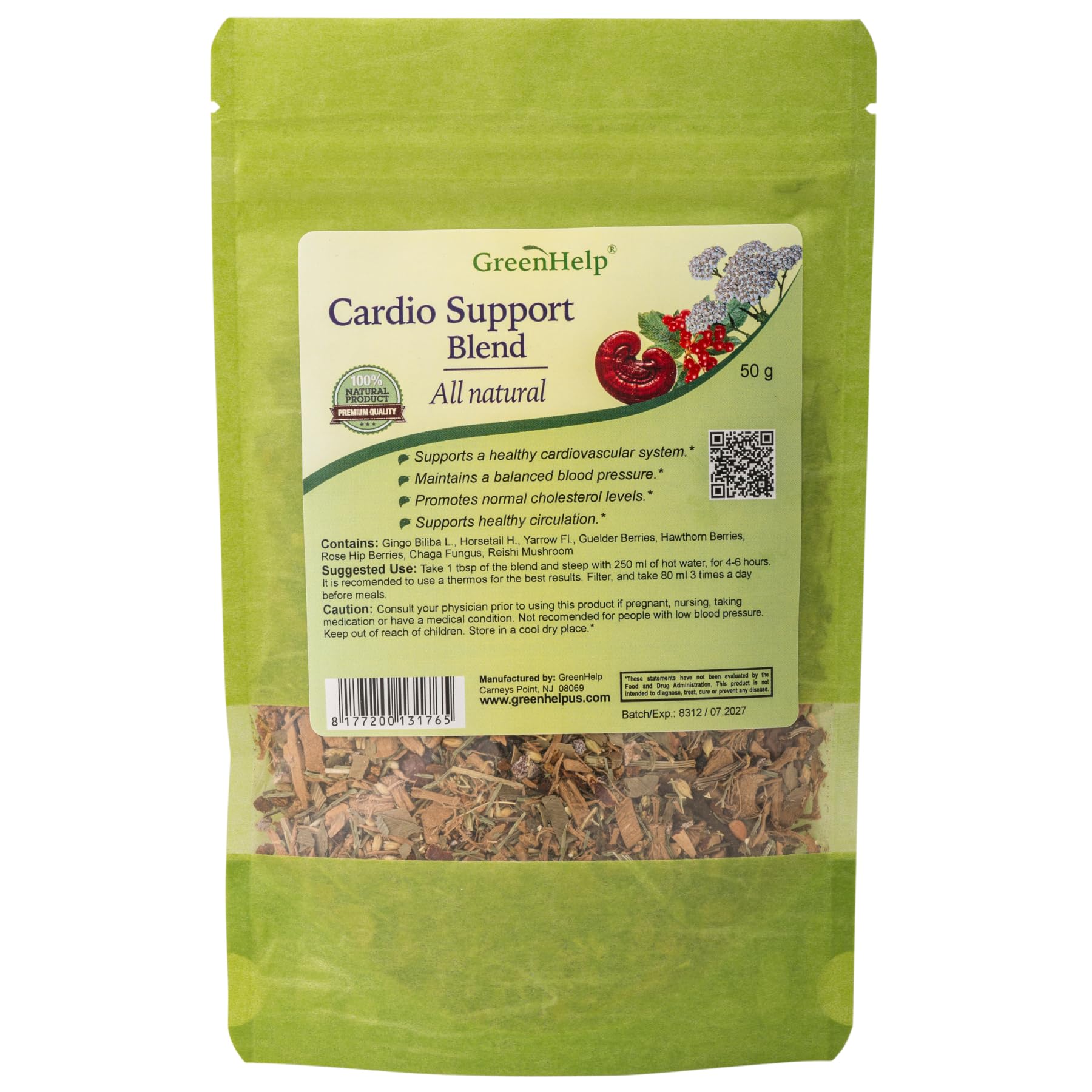 GreenHelp Cardio Support Blend is a natural herbal tea formulated to help support overall cardiovascular wellness. Made with a traditional blend of herbs including ginkgo biloba, horsetail, yarrow, guelder berries, hawthorn berries, rose hip, chaga fungus, and reishi mushroom, this formula may help promote balanced blood pressure and cholesterol levels while encouraging healthy circulation. This loose-leaf tea is designed for daily use and may provide gentle support for your heart and circulatory system when combined with a healthy lifestyle. Suggested Use: Steep 1 tsp of the blend in 250 mL of hot water for 4–6 hours. Strain and consume 1–3 times daily, 30 minutes before meals. Disclaimer: This product is not intended to diagnose, treat, cure, or prevent any disease. Results may vary. Consult your healthcare provider before use if pregnant, nursing, taking medications, or managing a health condition. Made in the USA
