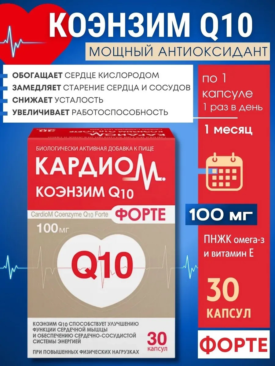 Each capsule contains 100 mg of active ingredients, including coenzyme Q10 and omega-3, which play a key role in maintaining heart and vascular health.